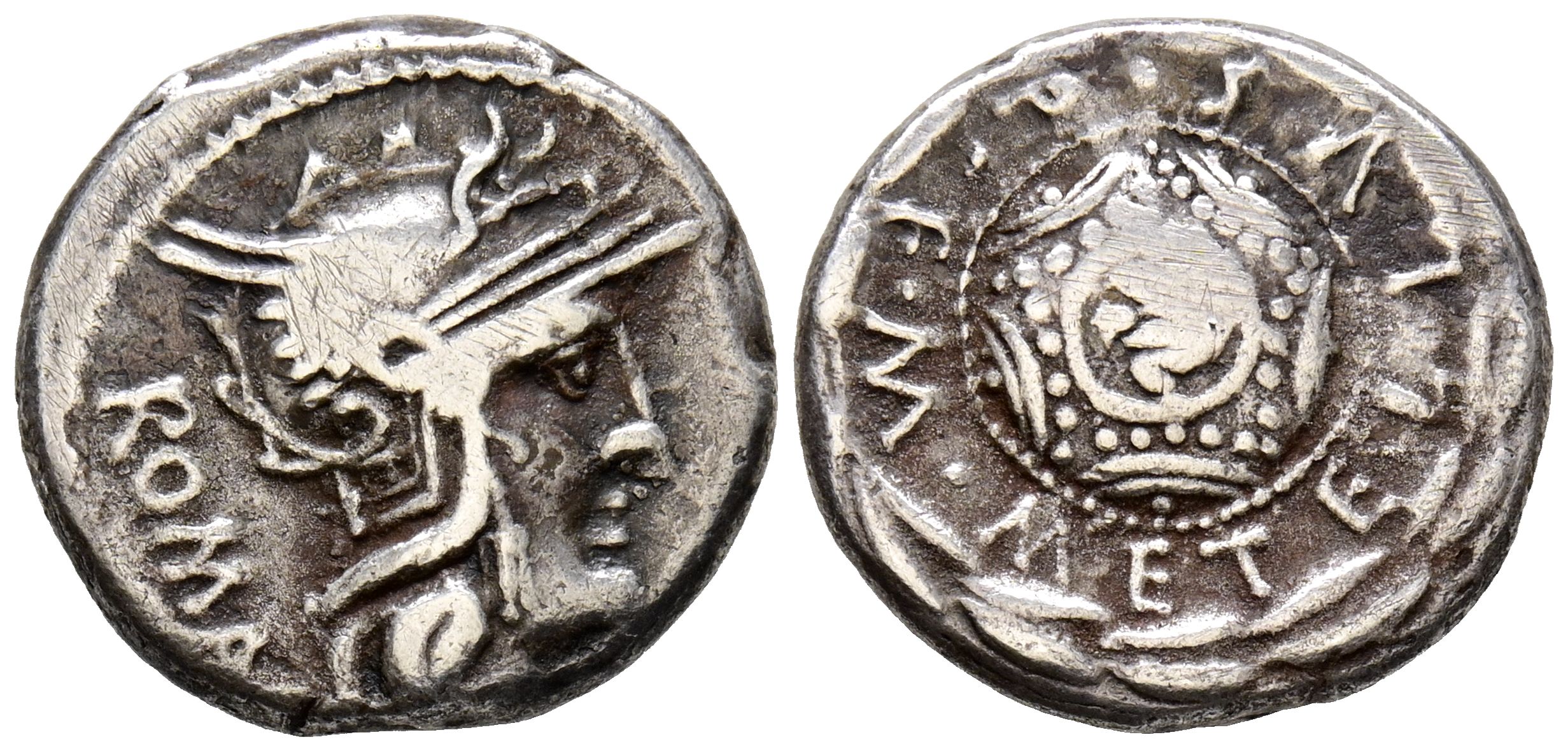 English GENS CAECILIA. Denarius. (Ar. 3.46g/17mm). 127 Fine Rome. (FFC 205; Crawford 263/1a). Obv: Head of Roma right, star in front, legend from bottom to top: ROMA. Rev: Macedonian shield, legend inside laurel wreath all around: M METELLVS Q F. Very Fine-.