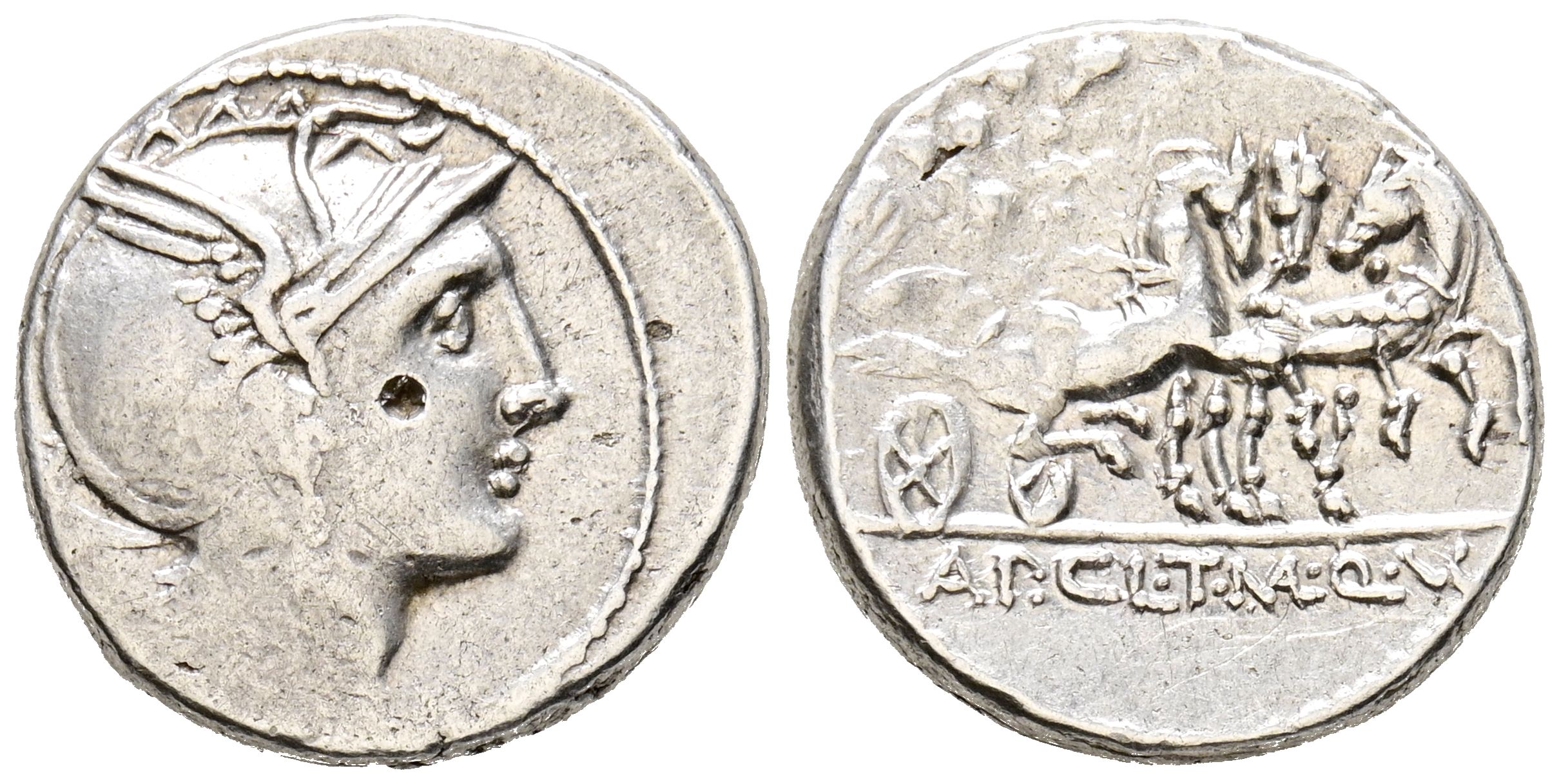 GENS CLAUDIA. Denarius. (Ar. 4.01g/17mm). 110-109 Fine Rome. (FFC 564; Crawford 299/1a). Obv: Head of Roma right, triangular object behind. Reverse: Victory in triga right, in exergue: AP CL T MANL Q VR. VF. Weak strikeage. Attempted perforation on obverse.