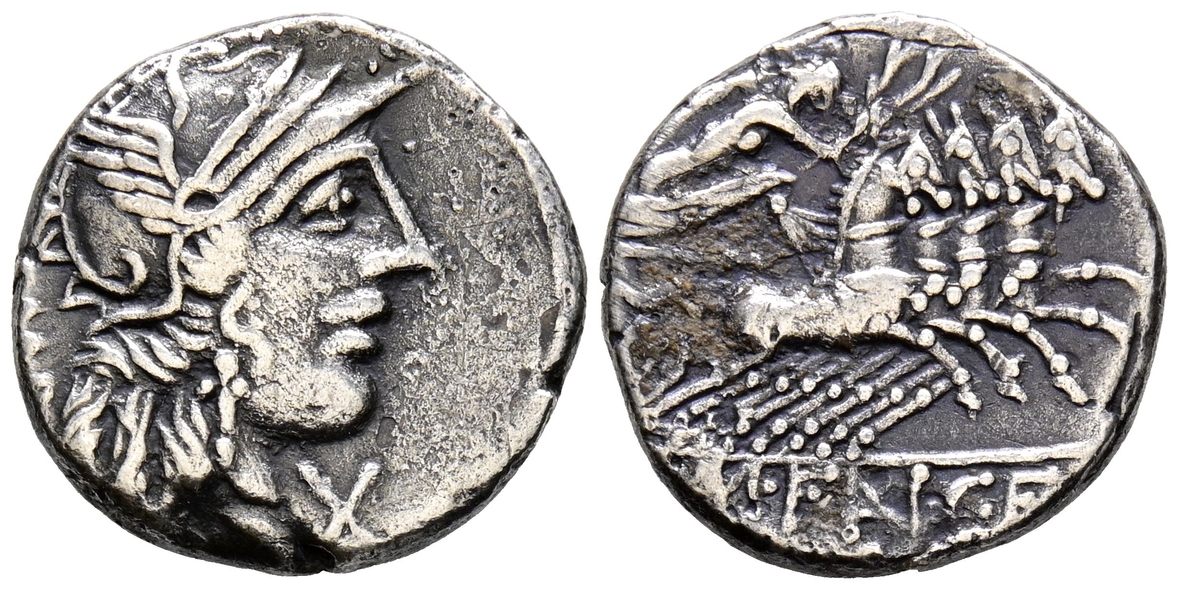 English GENS FANNIA. Denarius. (Ar. 3.76g/17mm). 123 Fine Rome. (FFC 705; Crawford 275/1). Obv: Head of Roma right, in front X, behind legend: ROMA. Rev: Victory with crown on quadriga right, in exergue: M FAN CF. Fine.