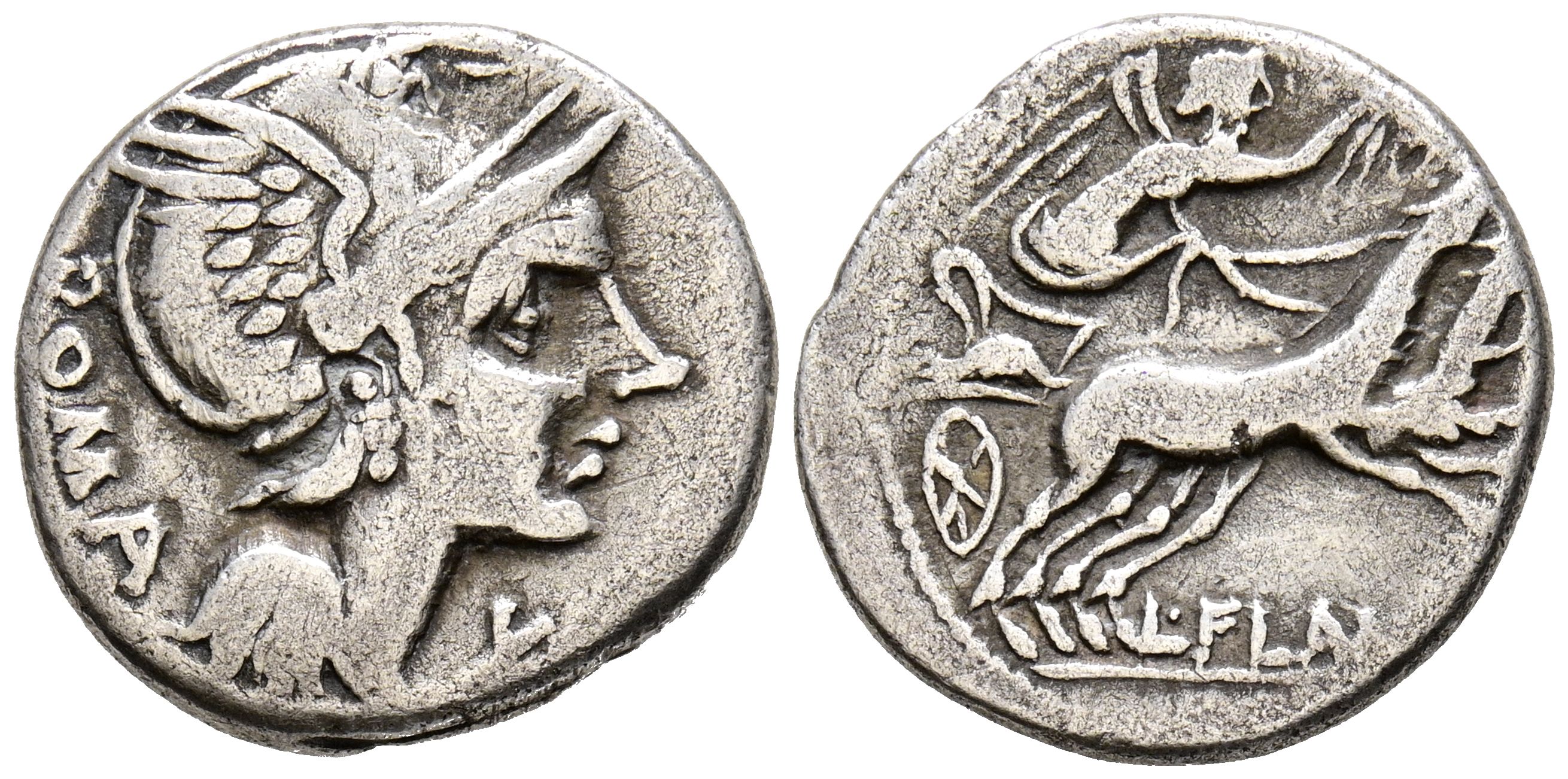 GENS FLAMINIA. Denarius. (Ar. 3.74g/18mm). 109-108 Fine Northern Italy. (FFC 708; Crawford 302/1). Obv: Head of Roma right, in front X, behind legend: ROMA. Rev: Victory with crown in biga right, below legend: L FLAMINI, in exergue: CILO. VF-.