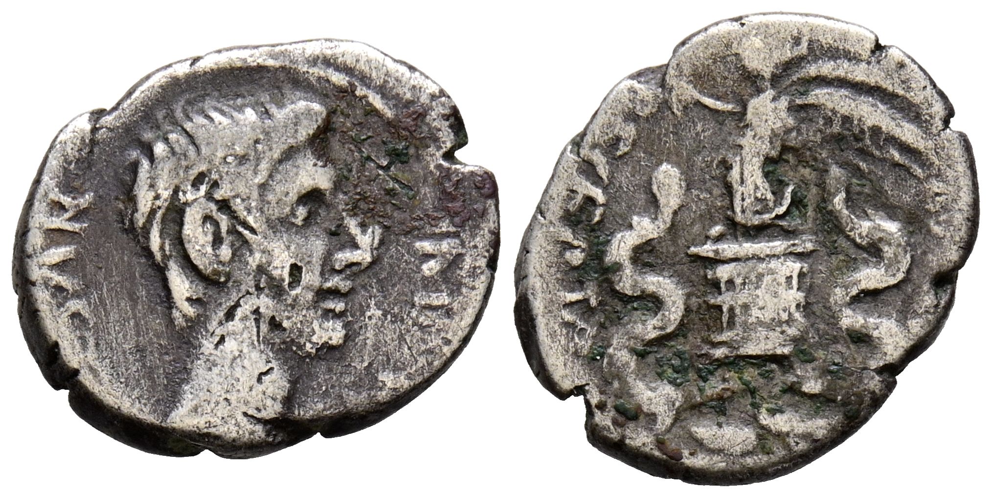 AUGUSTUS. Quinary. (Ar. 1.33g/14mm). 29-28 Fine Uncertain Italian mint. (RIC 276). Obv: Head of Augustus right, around legend: CAESAR IMP VII. Reverse: Draped Victory with crown and palm standing left on a mystical cist between two serpents, around legend: RECEPTA ASIA. VF.