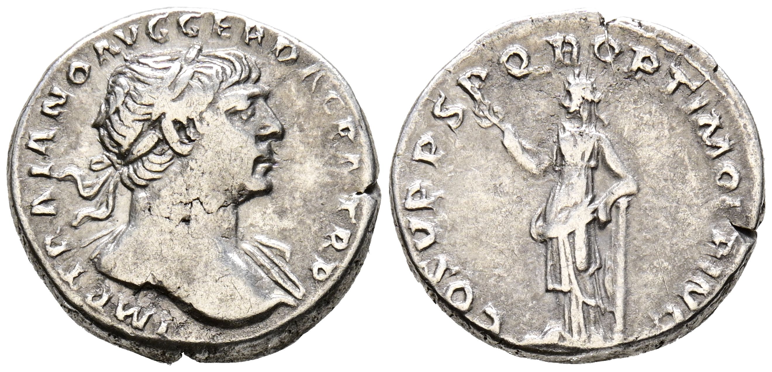 TRAJAN. Denarius. (Ar. 3.37g/18mm). 110 AD Rome. (RIC 126). Obv: Laureate head of Trajan facing right, around legend: IMP TRAIANO AVG GER DAC PM TR P. Rev: Felicitas standing left leaning on column carrying caduceus, around legend: COS VPP SPQR OPTIMO PRINC. Very Fine.