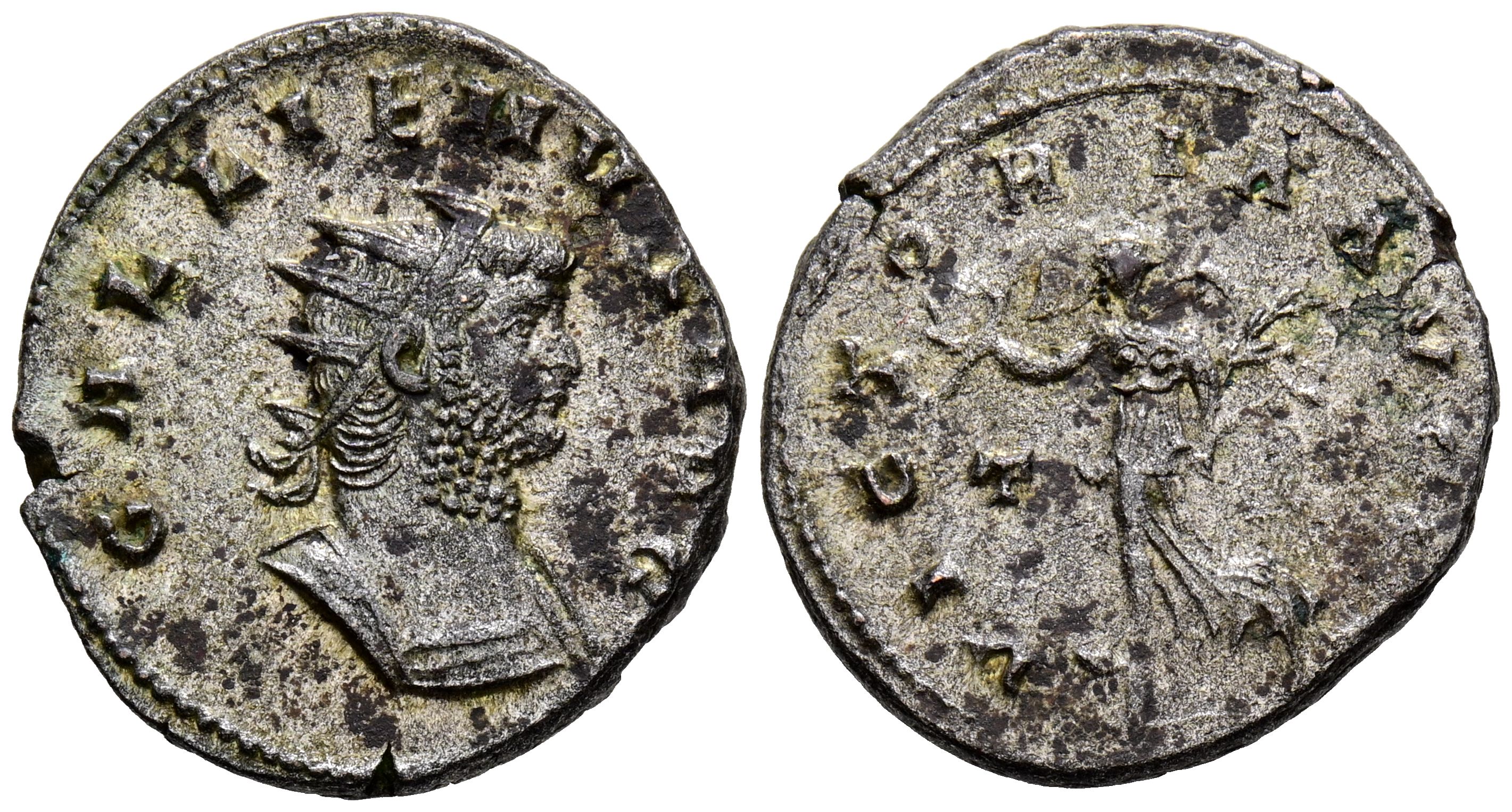 GALIENUS. Antoninianus. (Ve. 3.67g/21mm). 260-261 AD Rome. (RIC 305). Obverse: Radiant and cuirassed bust of Gallienus facing right, around legend: GALLIENVS AVG. Reverse: Victory advancing left carrying palm and laurel wreath, in field: T, around legend: VICTORIA AVG III. VF+. Remains of original silver plating.