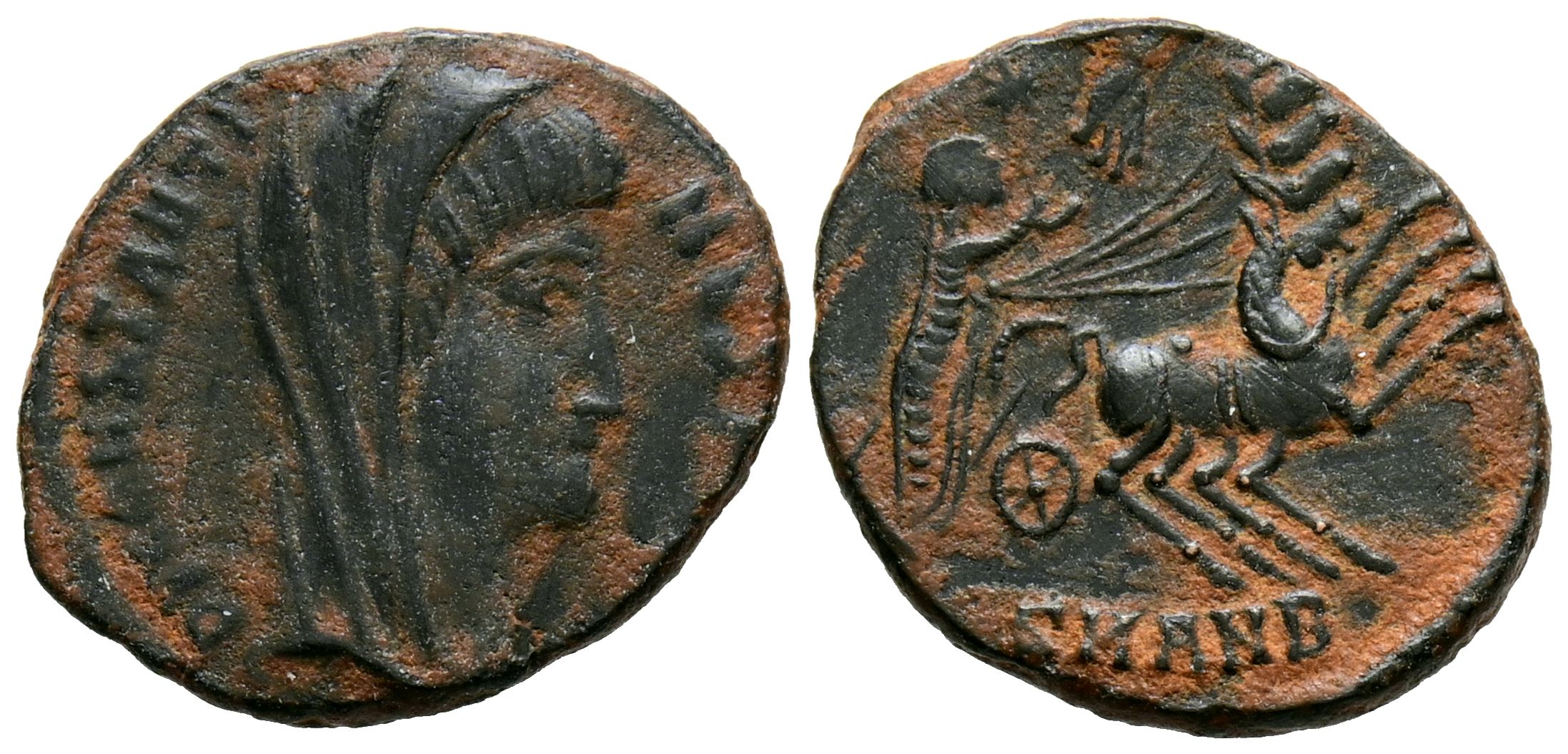 COSTANTINE I. Follis. (Ae. 1.82g/16mm). 337-340 AD Nicomedia. (RIC 39). Obverse: Veiled bust of Constantine I facing right, around legend: DV CONSTANTINVS PT AVGG. Reverse: Constantine I, veiled and draped, riding on a quadriga on the right, with the hand of God extended towards him, below: SMANB. Very Fine.