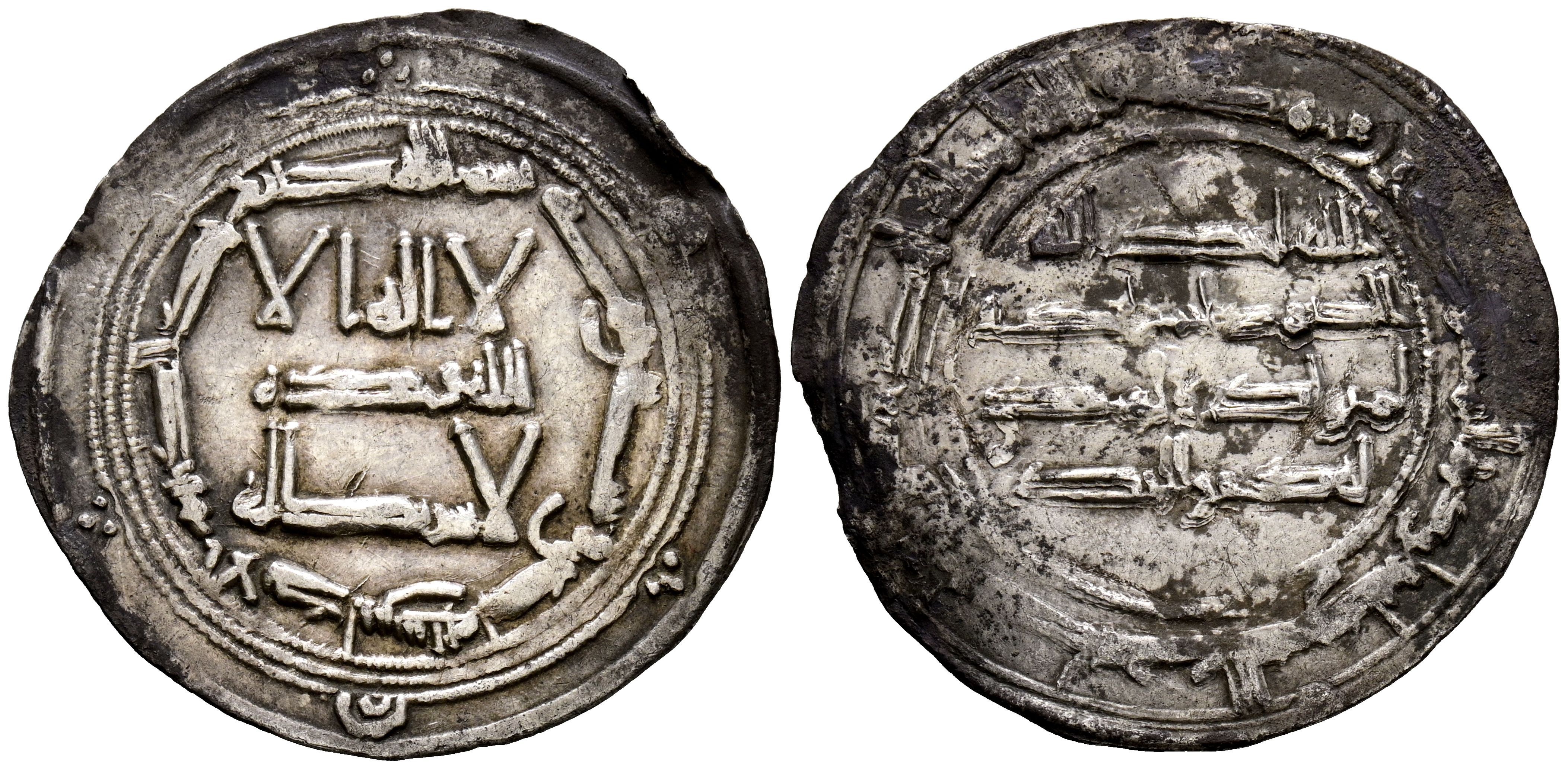 INDEPENDENT EMIRATE OF CORDOBA, 'Abd al-Rahman I. Dirham. (Ar. 2.68g/30mm). 161H. al-Ándalus / الاندلس. (Vives 59; R. Frochoso 161.1). VF. Oxidations and slight bend on edge. Remains of original shine.