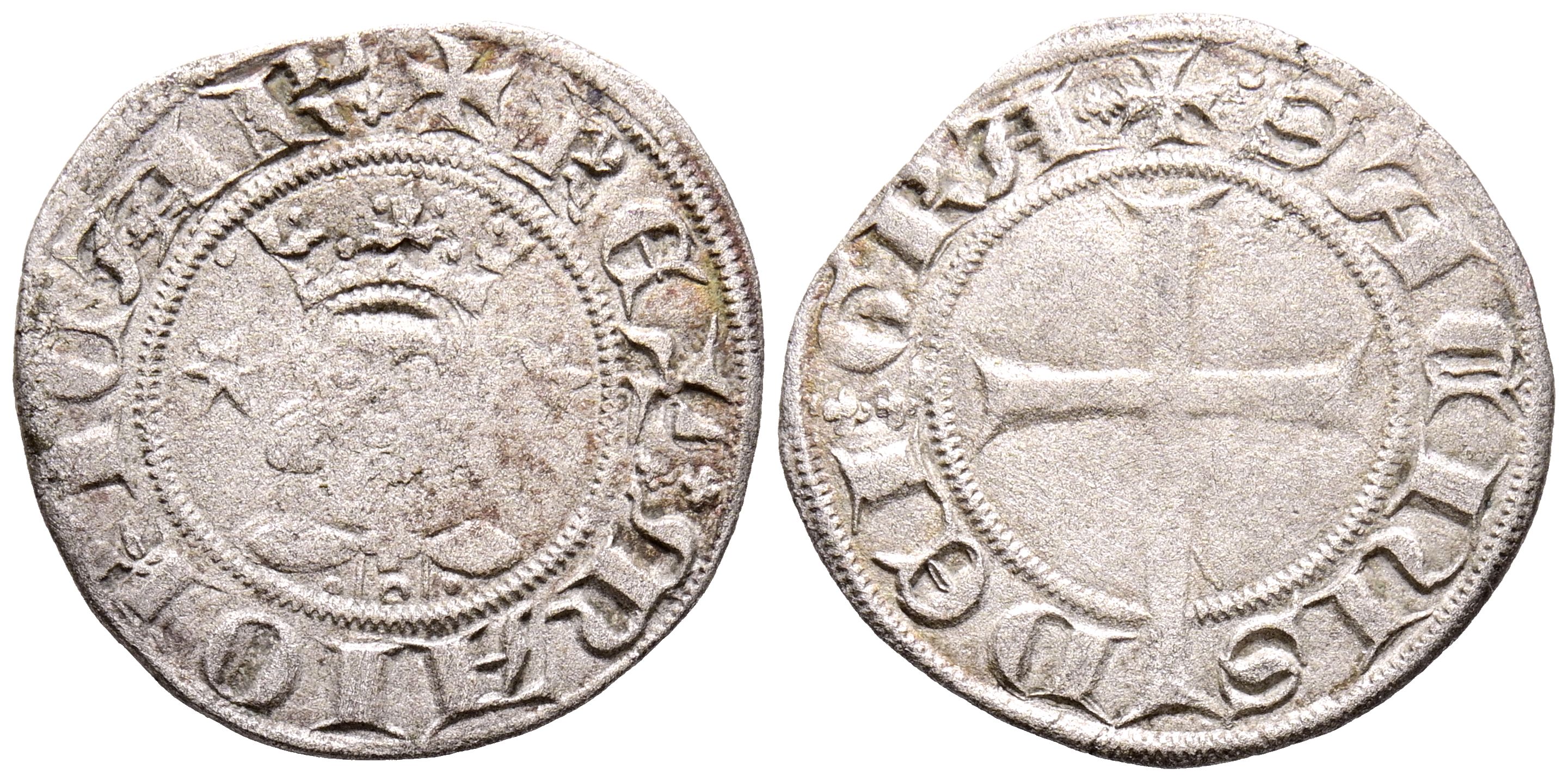 SANCHO I (1311-1324). Dobler (Ve. 1.51g/20mm). Mallorca. (Cru VS 547). Obverse: Bust of Sancho I facing forward between stars, legend around: REX MAIORICAR. Reverse: Latin cross, legend around: SACIVS DEI GRA. Good Very Fine.