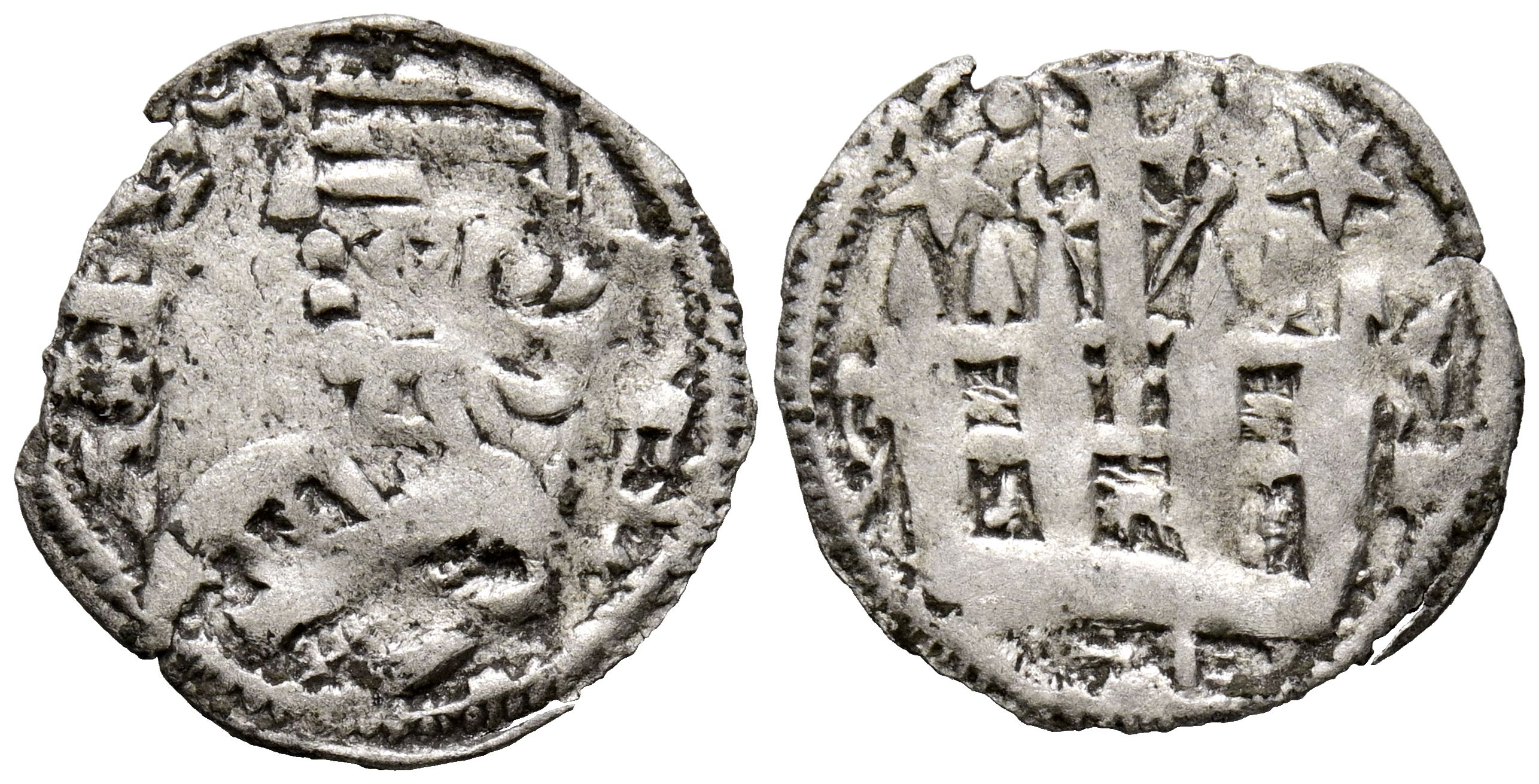 ALFONSO VIII (1158-1214). Money. (Ve. 0.82g/18mm). Possibly Toledo. (Imperatrix A8:36.29; FAB-205). Obv: Crowned bust of Alfonso VIII left, legend around: ANFVS REX. Rev: Castle with central decorated cross, crescent on the left, star on the right, legend around: CASTELE. VF. Small flaw in the coin blank.