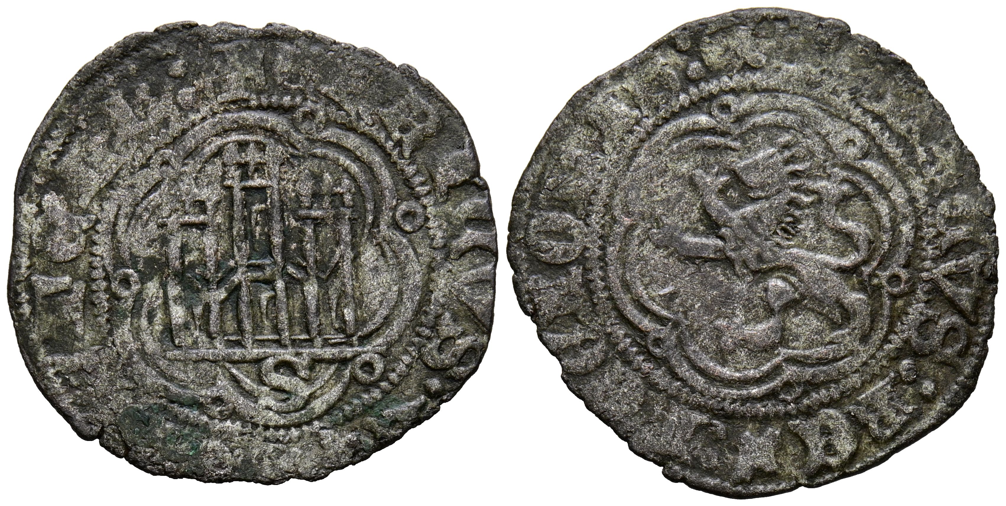 HENRY III (1390-1406). White. (Ae. 1.95g/24mm). Seville. (Imperatrix E3:1.11; FAB-602). Obv: Castle, below S, all within lobular beading, surrounding legend: ENRICVS REX CASTELL. Rev: Lion rampant left, within lobular beading, surrounding legend: ENRICVS REX LEGIONIS E. Very Fine.