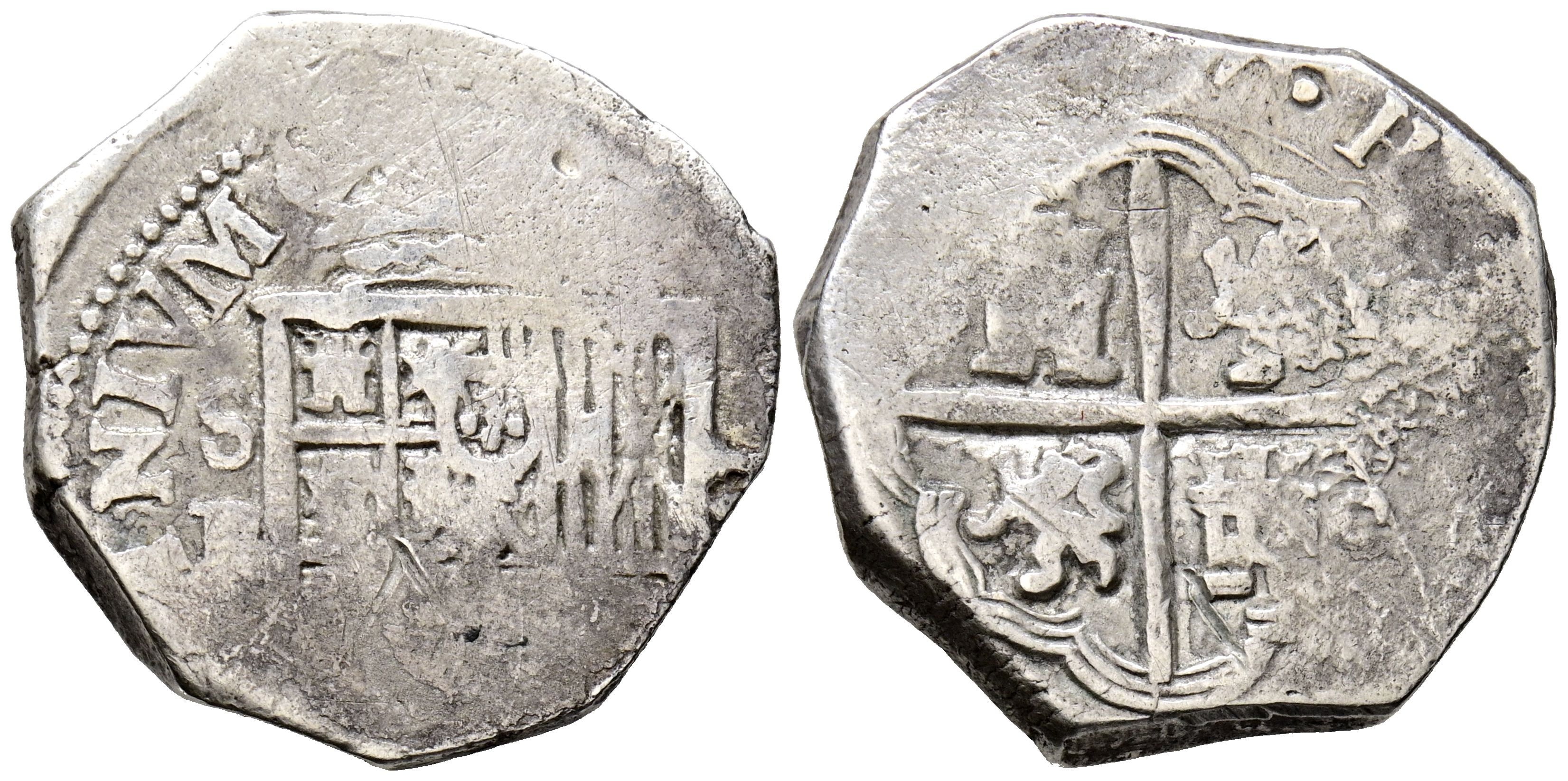 FELIPE III (1598-1621) 2 Reales (Ar. 6.65g/23mm). Date not visible. Seville B. Omnivm type. (Cal-2019-Type 134). Very Fine-. Scarce.