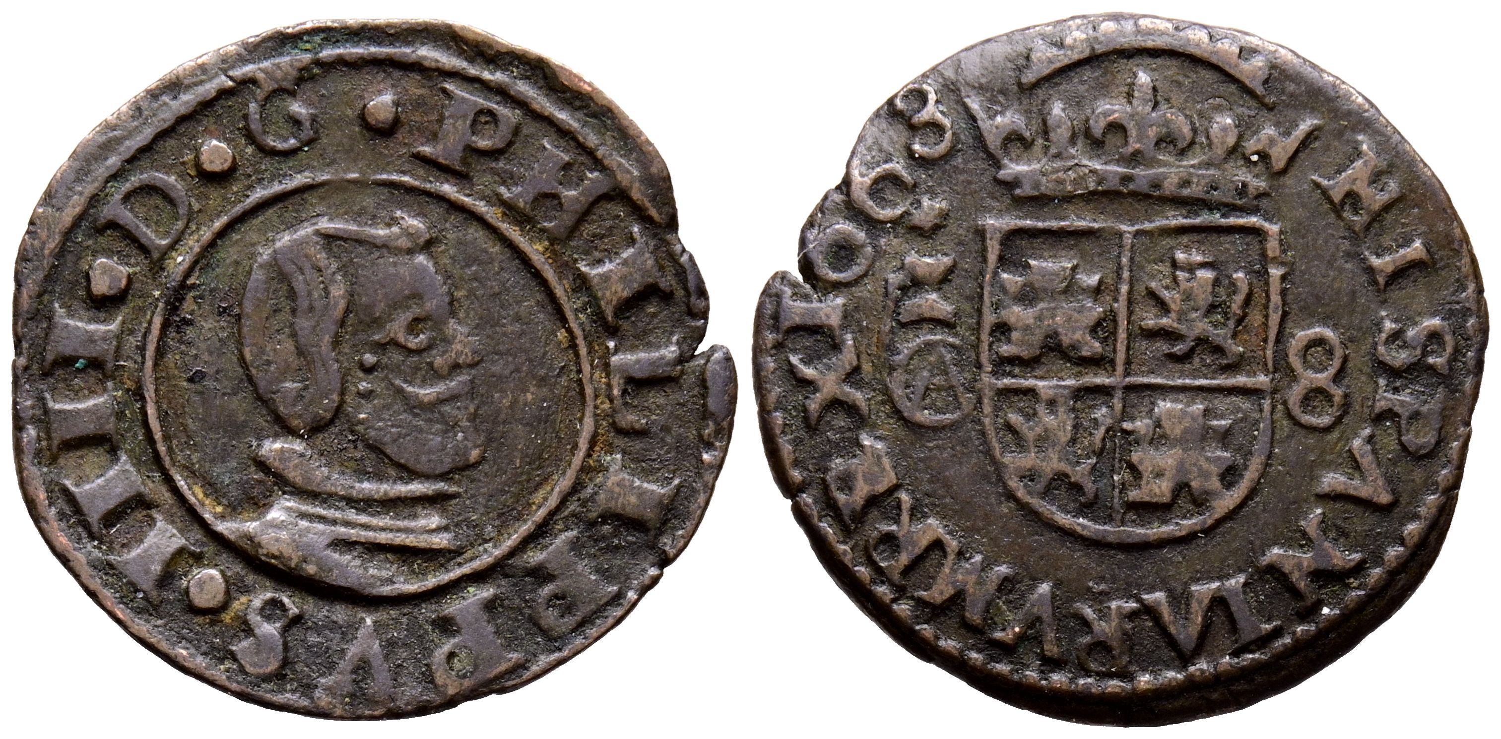 PHILIP IV (1621-1665). 8 Maravedís (Ae. 2.00g/21mm). 1663. Cuenca. (Cal-2019-331). Very Fine.
