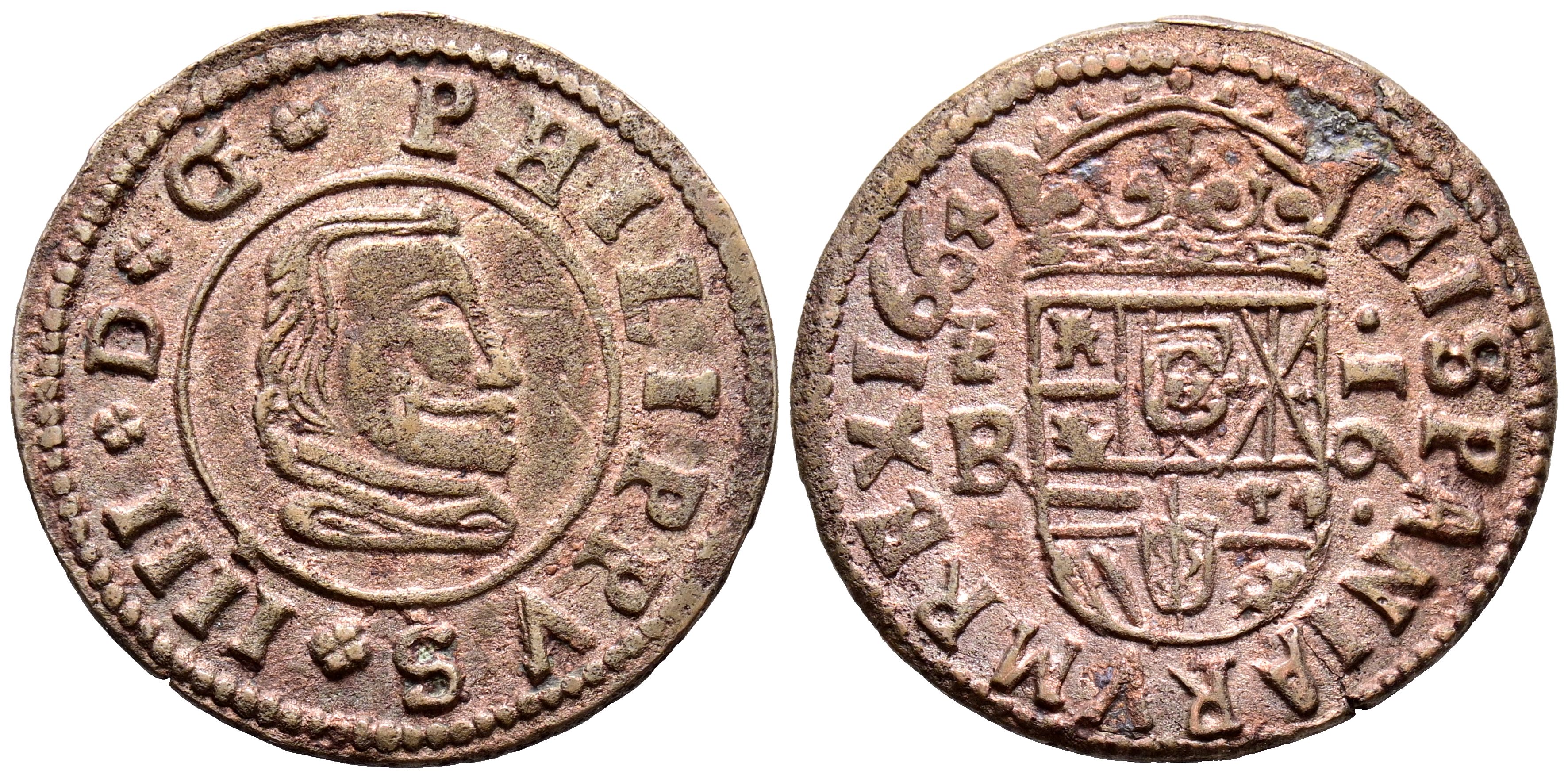 English PHILIP IV (1621-1665). 16 Maravedis. (Ve. 4.57g/25mm). 1664. Segovia B. (Cal-2019-491). Extremely Fine/Extremely Fine-.