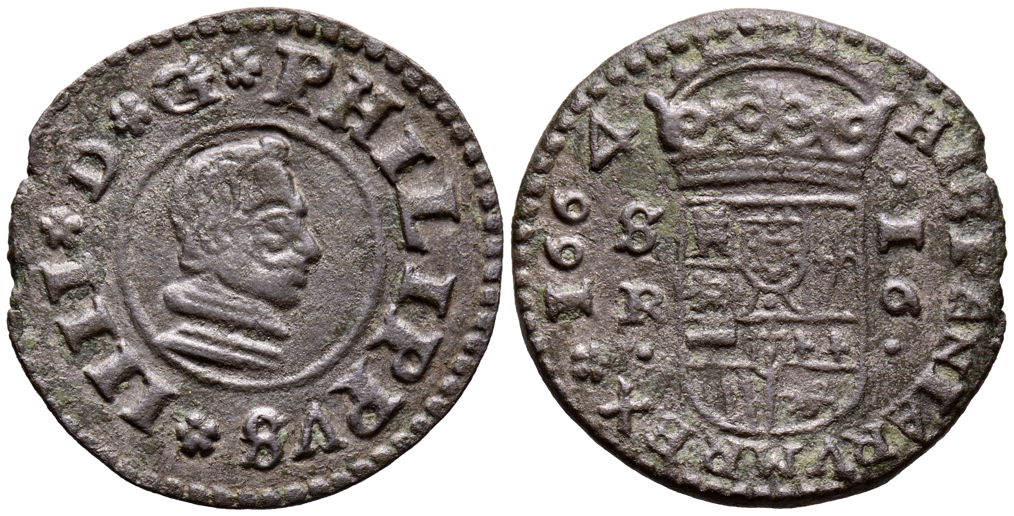 PHILIP IV (1621-1665). 16 Maravedis. (Ae. 3.57g/25mm). 1664. Sevilla R. (Cal-2019-498). Very Fine.