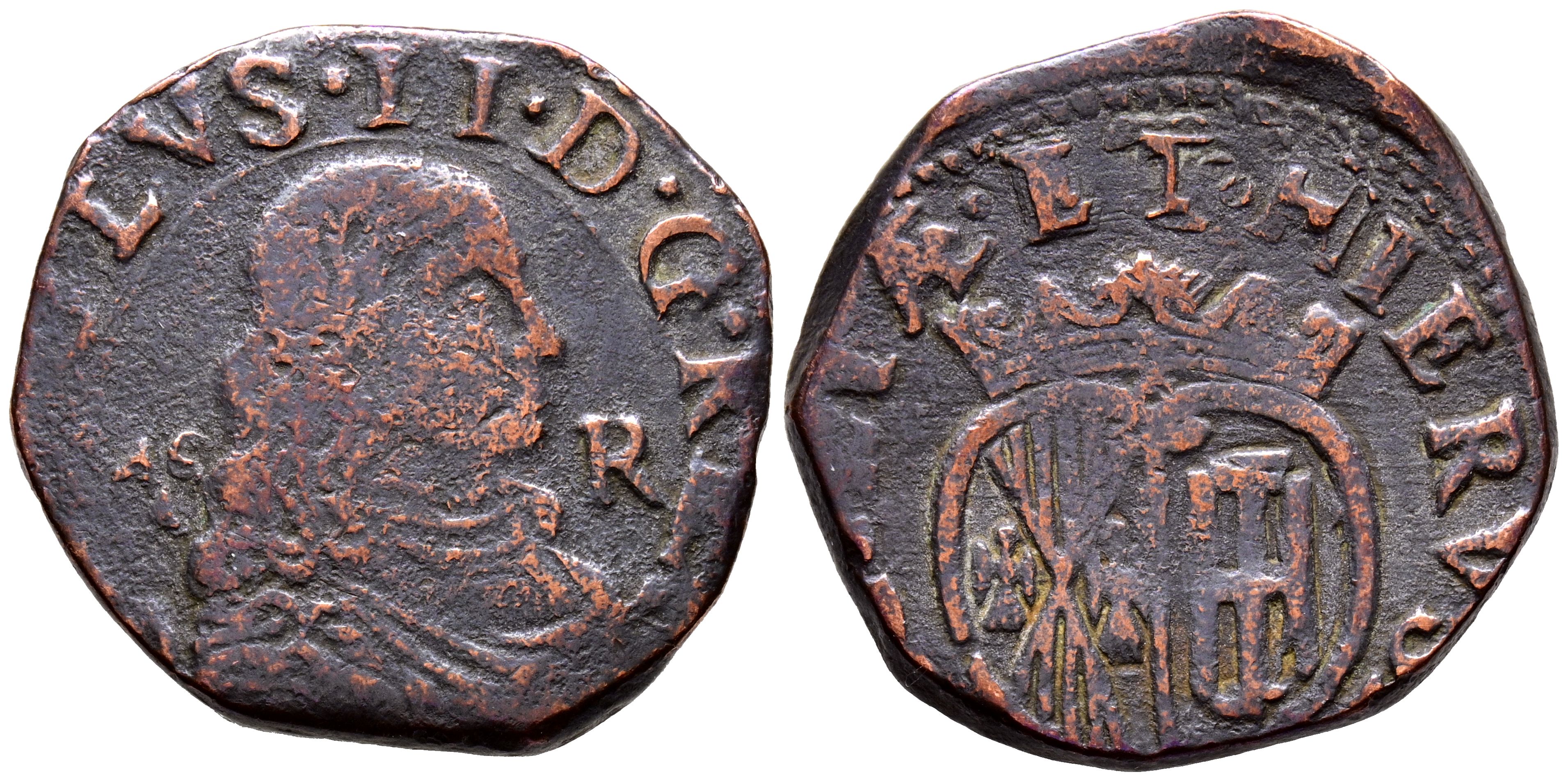 CHARLES II (1665-1700). 1 Grain. (Ae. 8.21g/26mm). Date not visible. Naples AC/A. (Vicenti type 52). Very Fine-.
