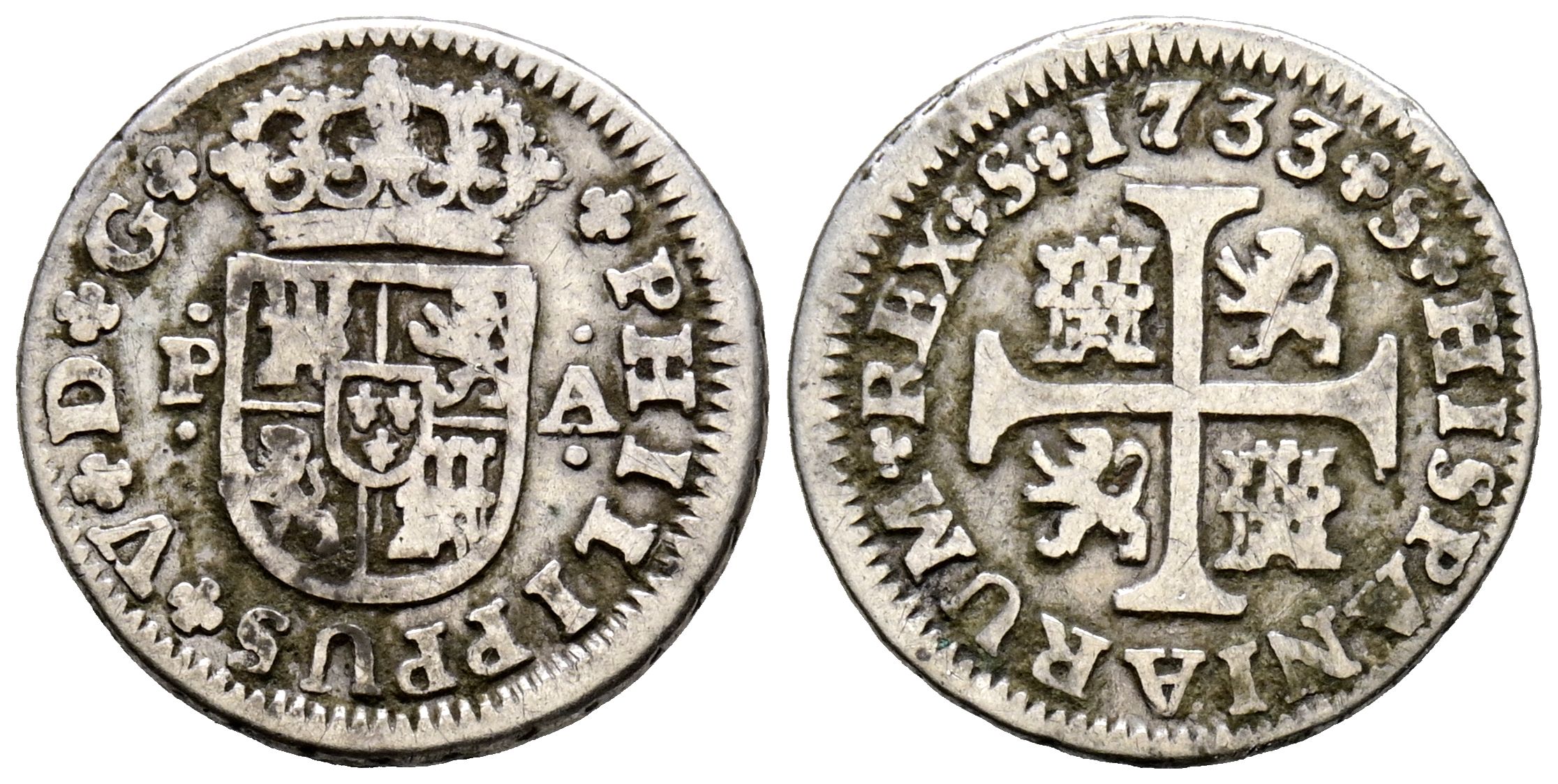 PHILIP V (1700-1746). 1/2 Real. (Ar. 1.39g/15mm). 1733. Seville PA. (Cal-2019-339). Very Fine-.