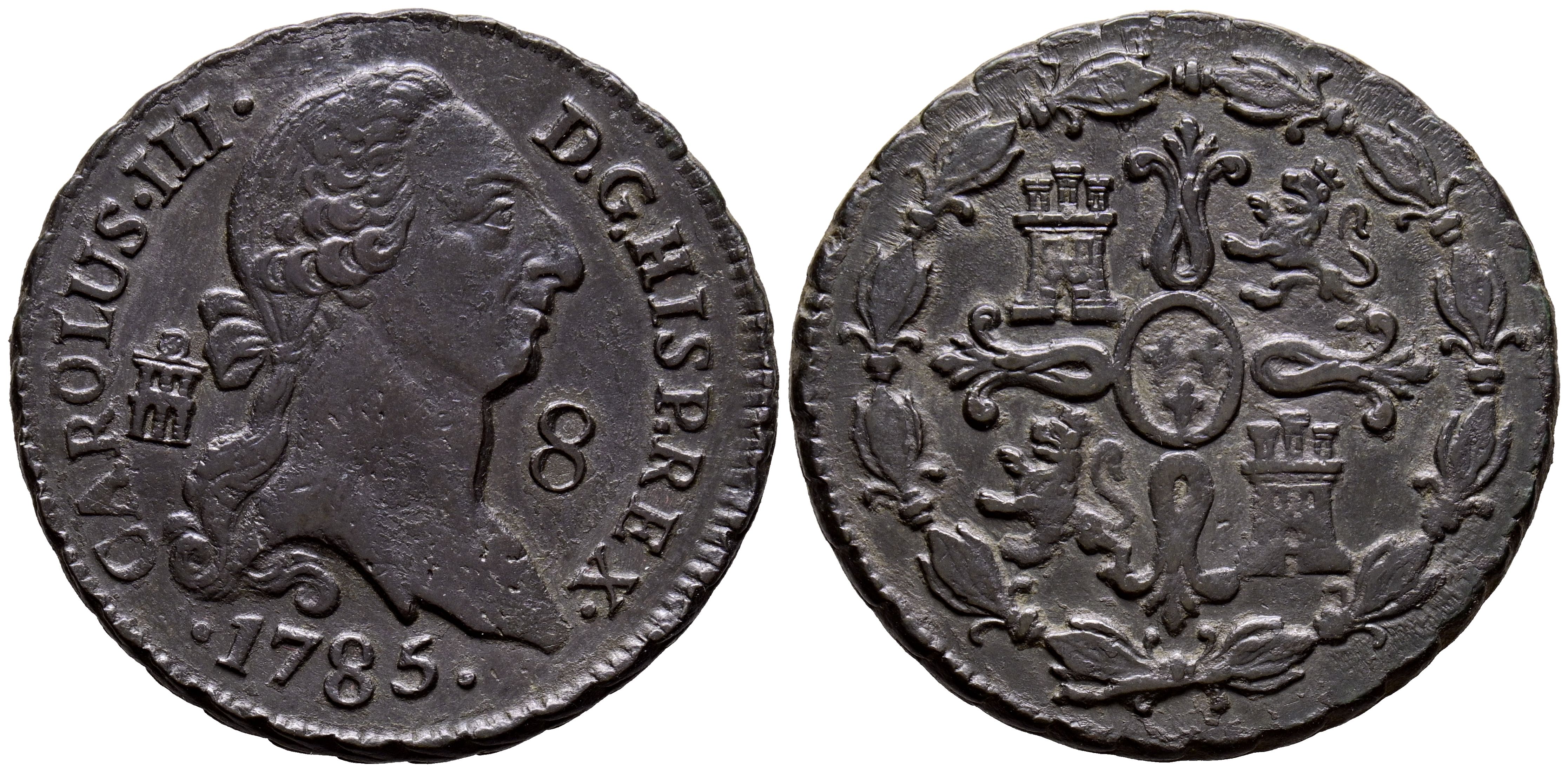 English CHARLES III (1759-1788). 8 Maravedís (Ae. 12.20g/30mm). 1785. Segovia. (Cal-2019-81). Good Very Fine.