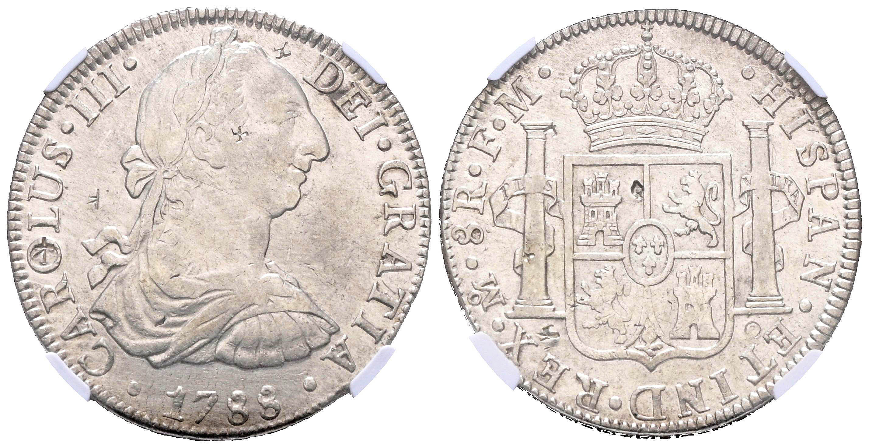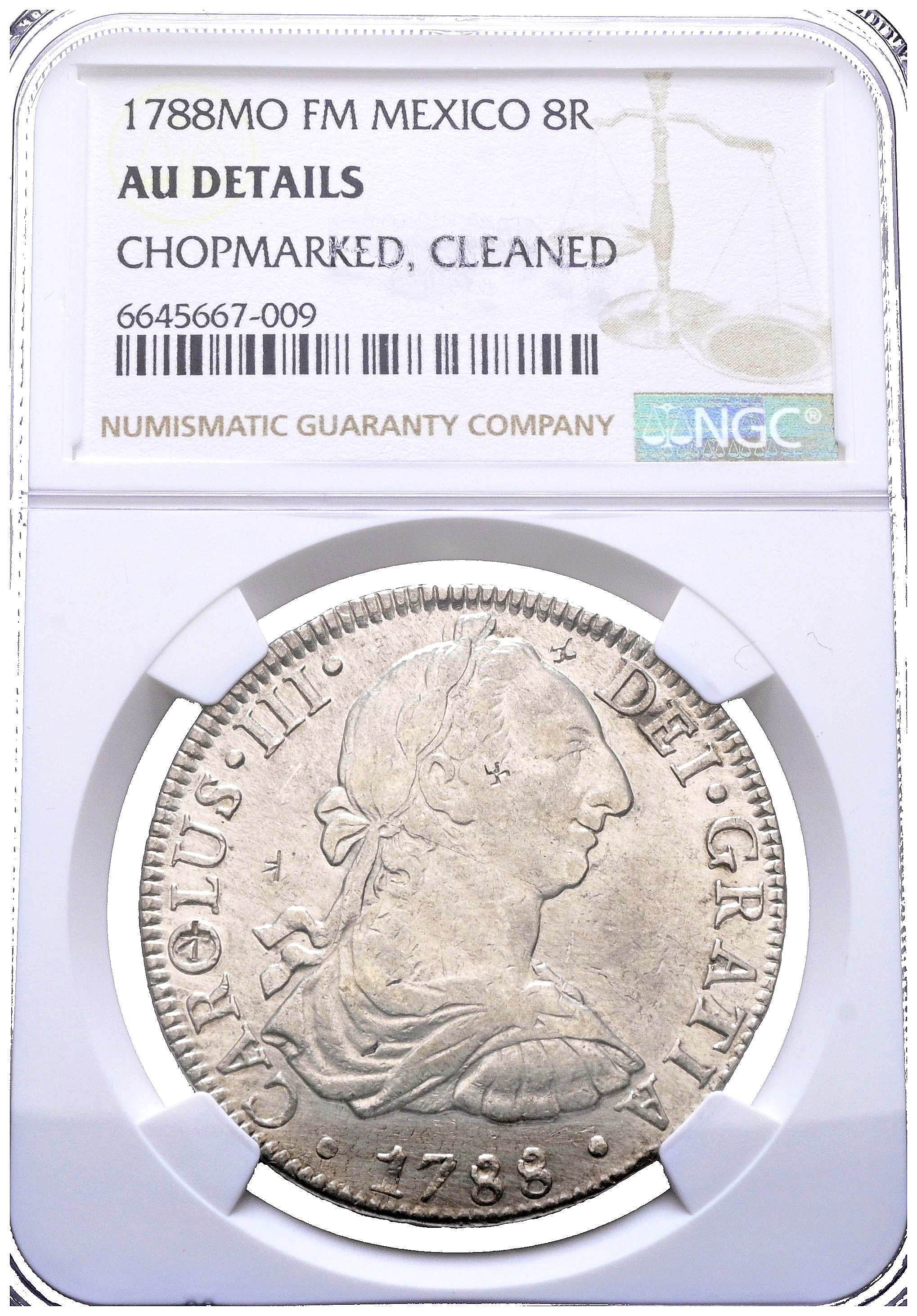 CHARLES III (1759-1788). 8 Reales. (Ar. 27,00g/37mm)*. 1788. Mexico FM. Encapsulated by NGC AU Details, Chopmarked.* Theoretical weight and measurements.