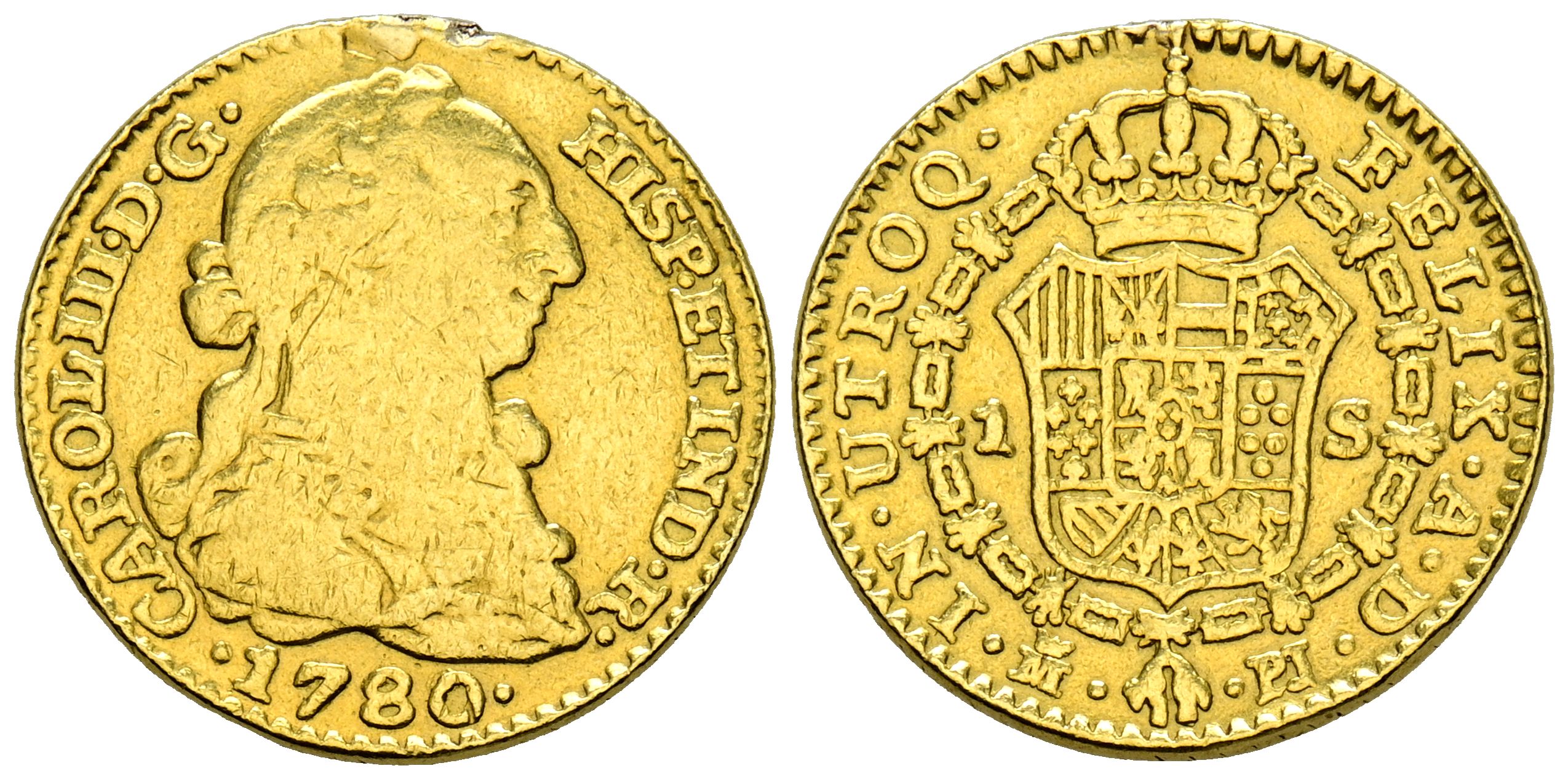 English CHARLES III (1759-1788). 1 Escudo. (Au. 3.30g/18mm). 1780. Madrid PJ. (Cal-2019-1359). VF-. Used as a jewel.
