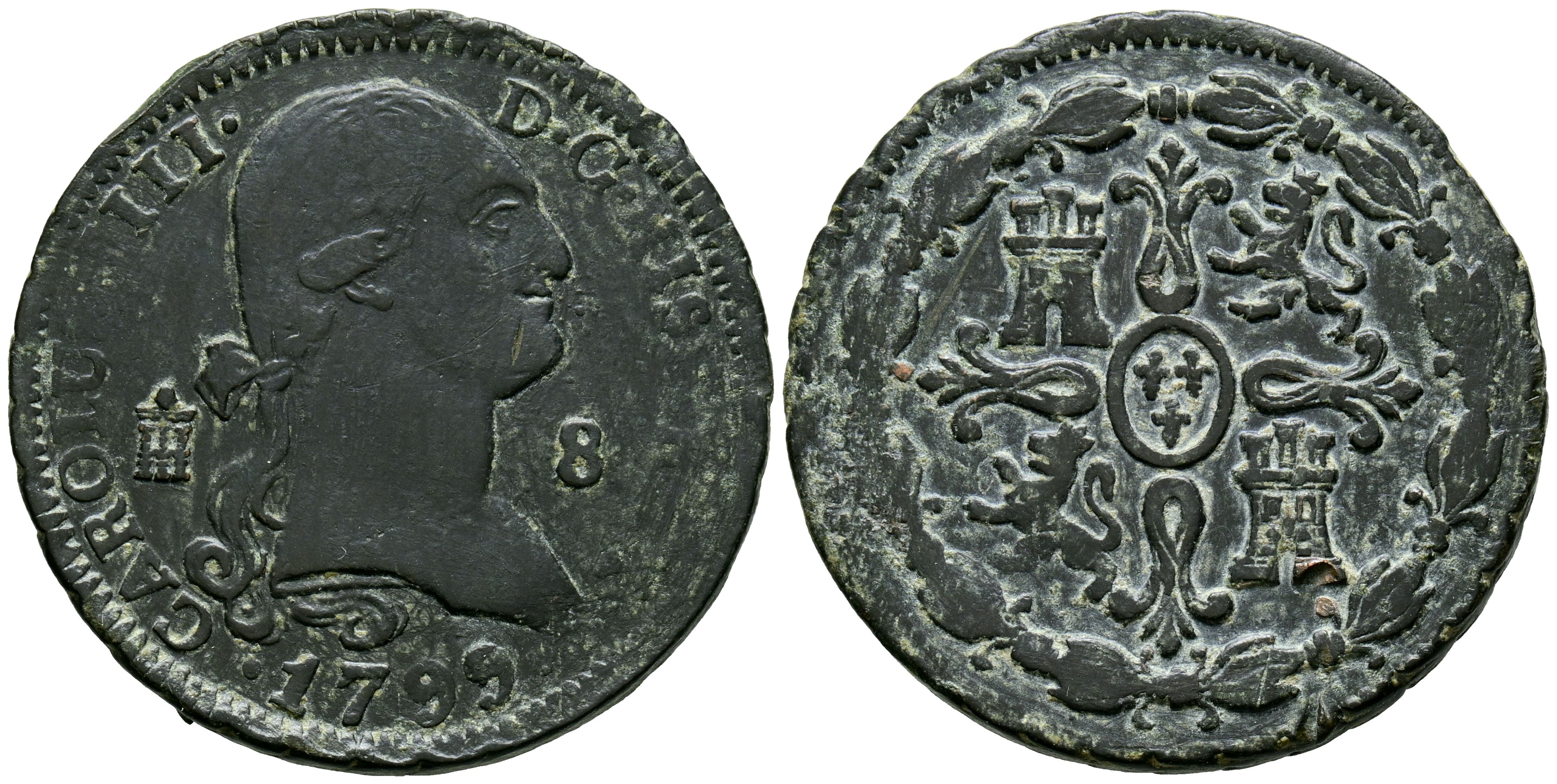 CHARLES IV (1788-1808). 8 Maravedis. (Ae. 10.76g/31mm). 1799. Segovia. (Cal-2019-76). Very Fine.