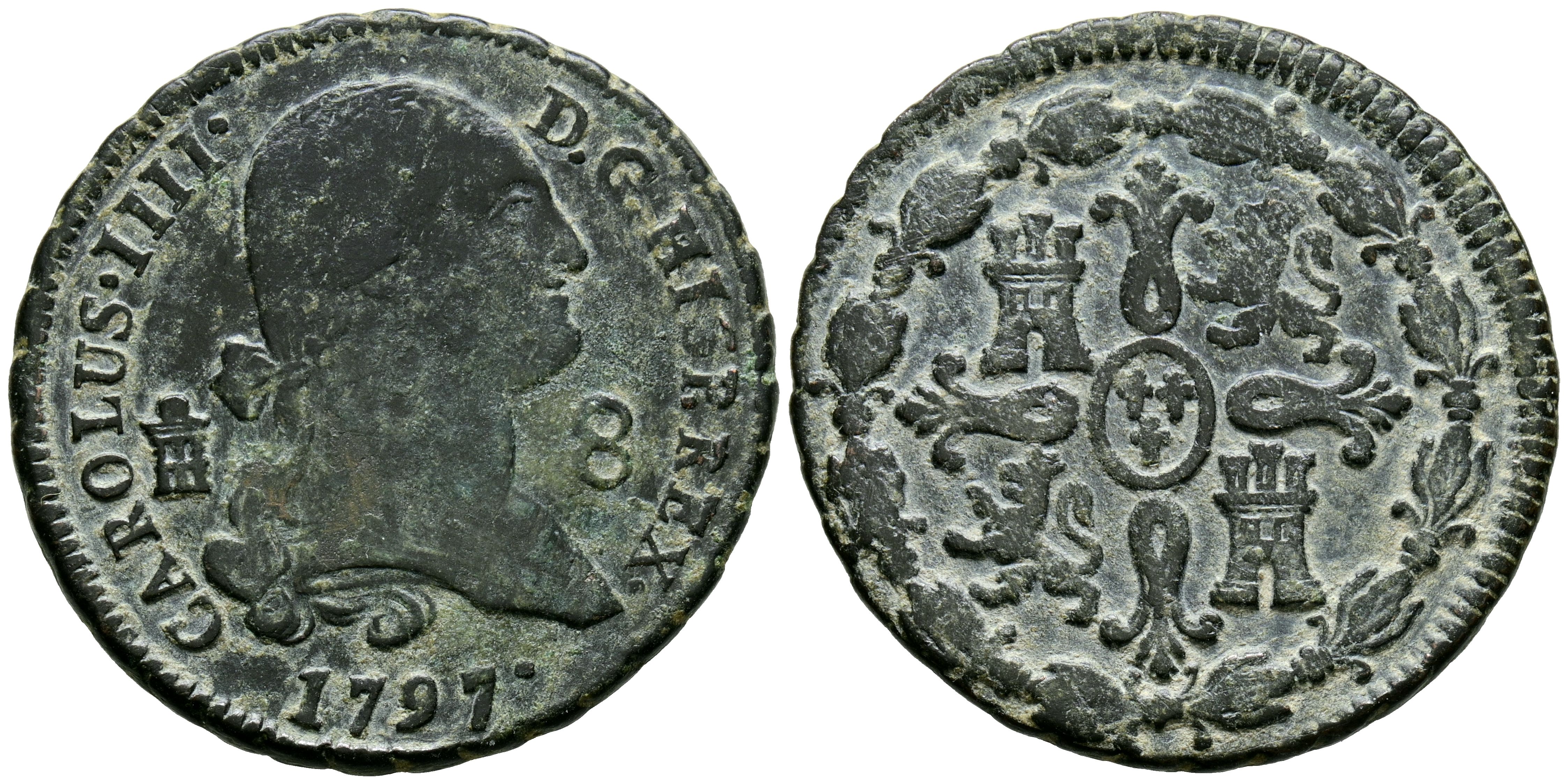 English CHARLES IV (1788-1808). 8 Maravedis. (Ae. 11.87g/32mm). 1797. Segovia. (Cal-2019-74). Very Fine-.