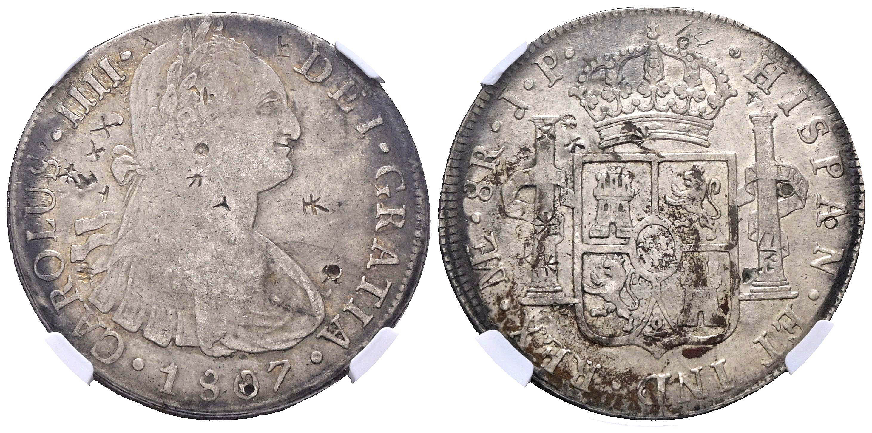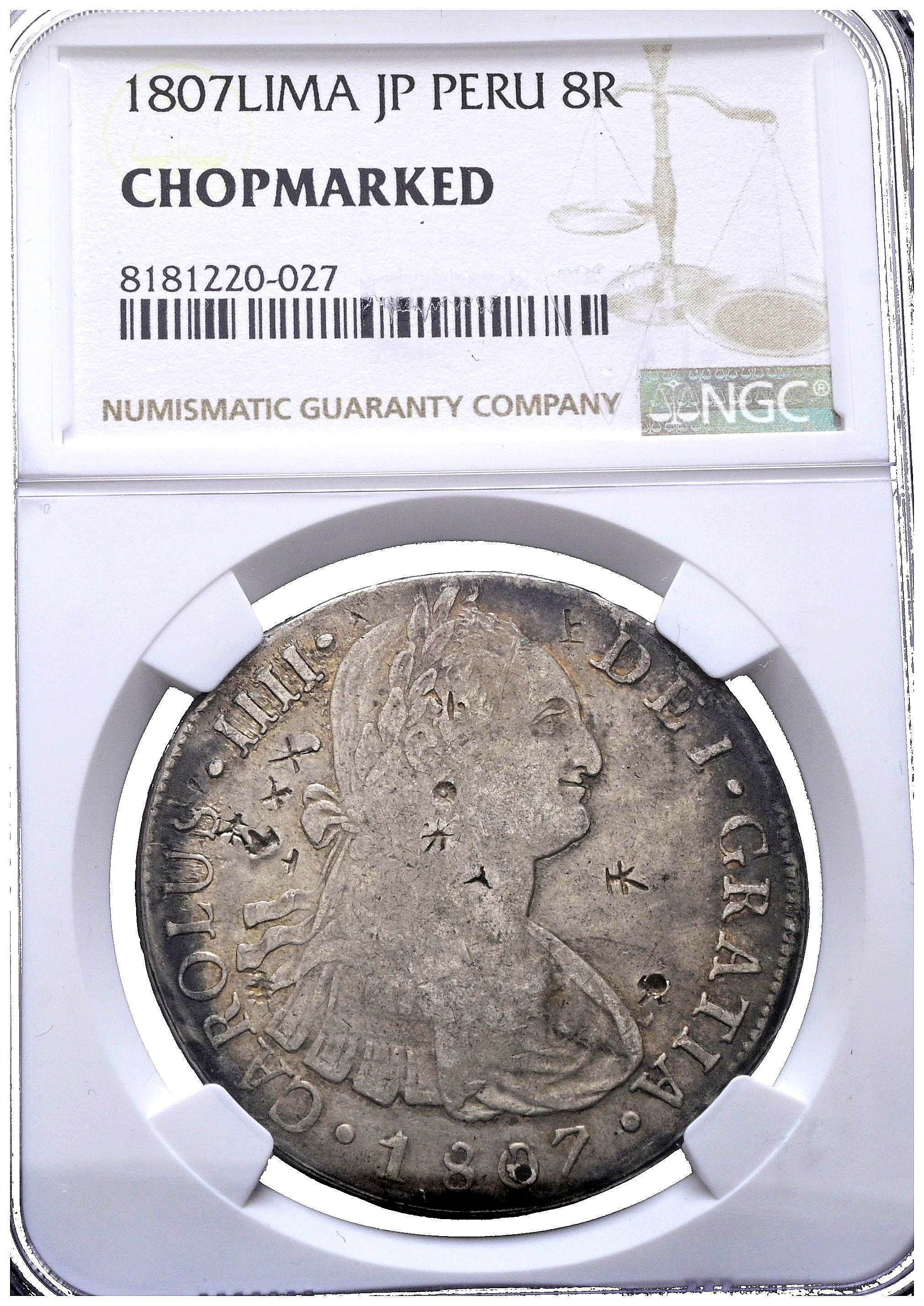 English CARLOS IV (1788-1808). 8 Reales. (Ar. 27,00g/38mm)*. 1807. Lima JP. (Cal-2019-927). Encapsulated by NGC Chopmarked. *Theoretical weight and measurements.