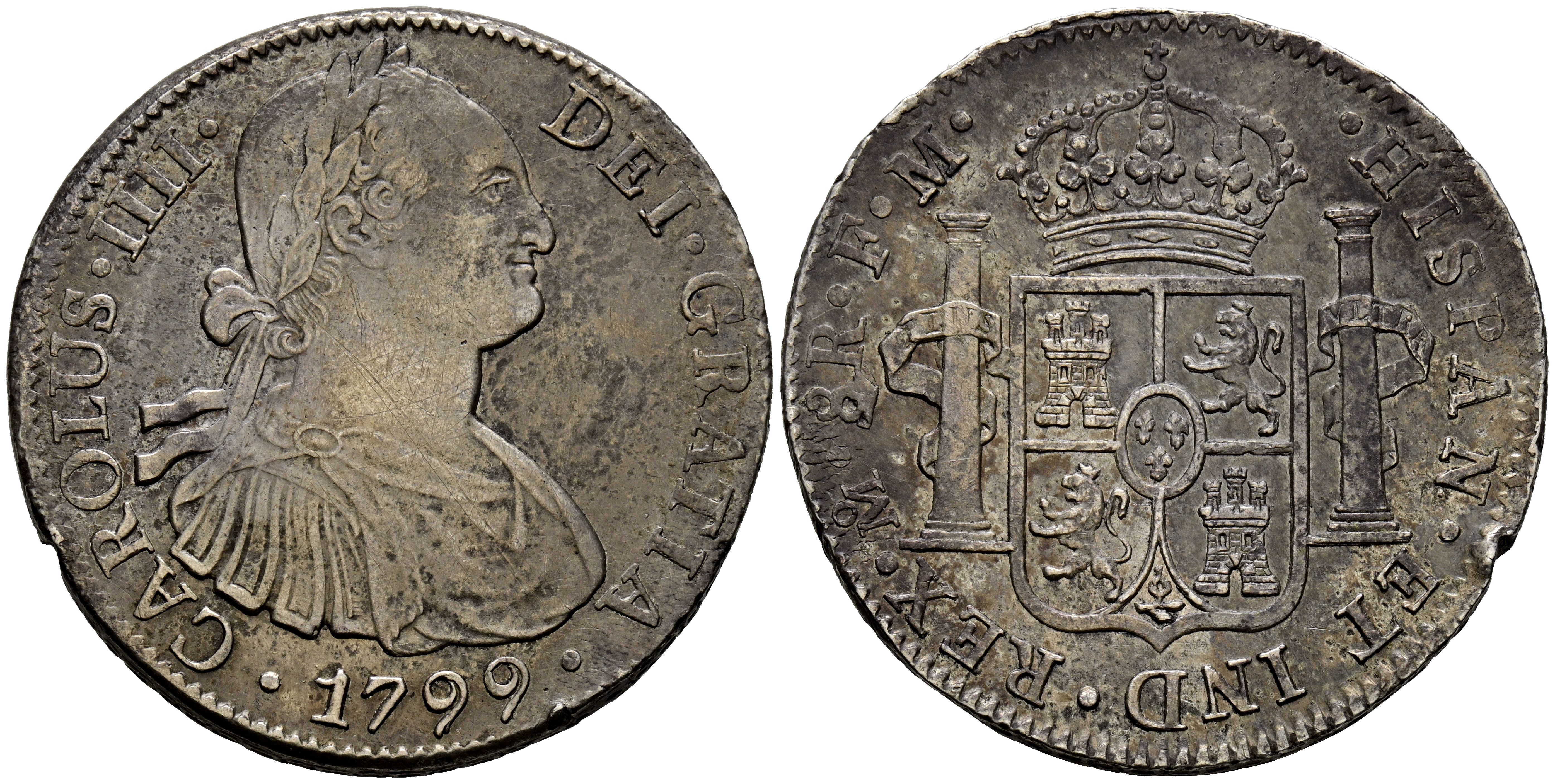 CHARLES IV (1788-1808). 8 Reales. (Ar. 26.86g/39mm). 1799. Mexico FM. (Cal-2019-963). VF/VF+. Lines on obverse. Artificial patina.
