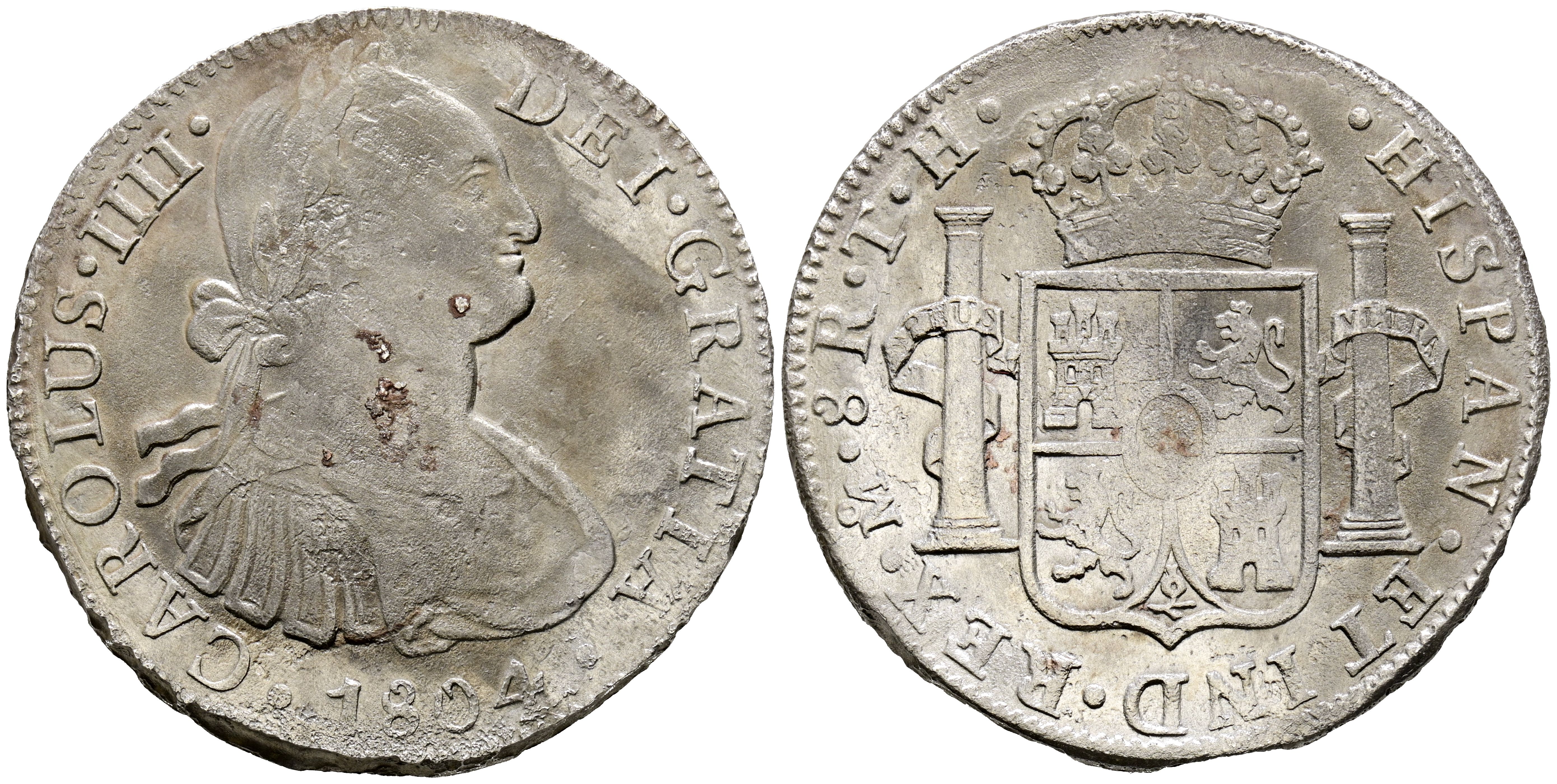 English CHARLES IV (1788-1808). 8 Reales. (Ar. 25,25g/39mm). 1804. Mexico TH. (Cal-2019-980). VF+. Cleaned oxidations. Patina.