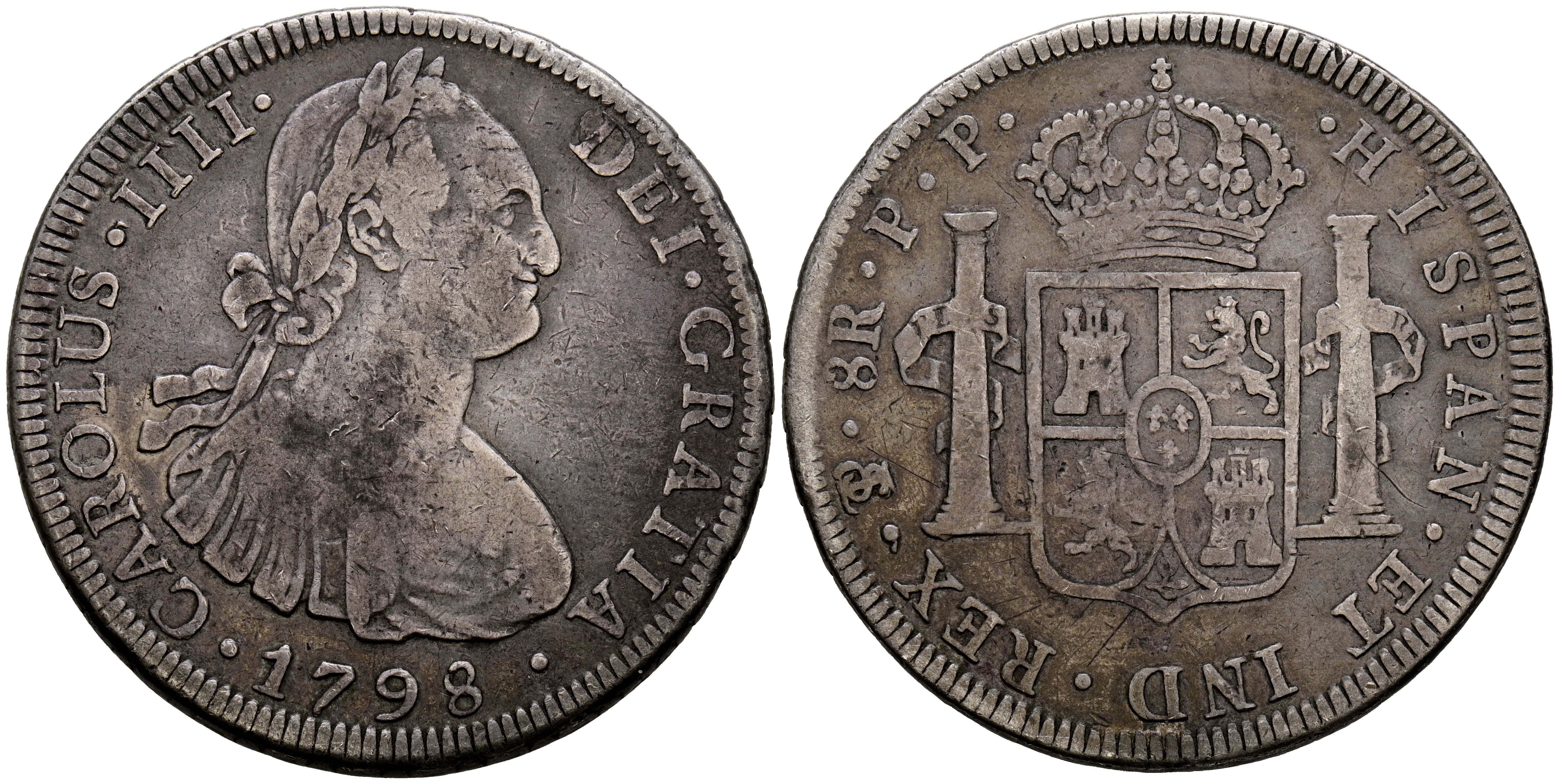English CHARLES IV (1788-1808). 8 Reales. (Ar. 26.6g/41mm). 1798. Potosi. PP. (Cal-2019-1002). Very Fine.