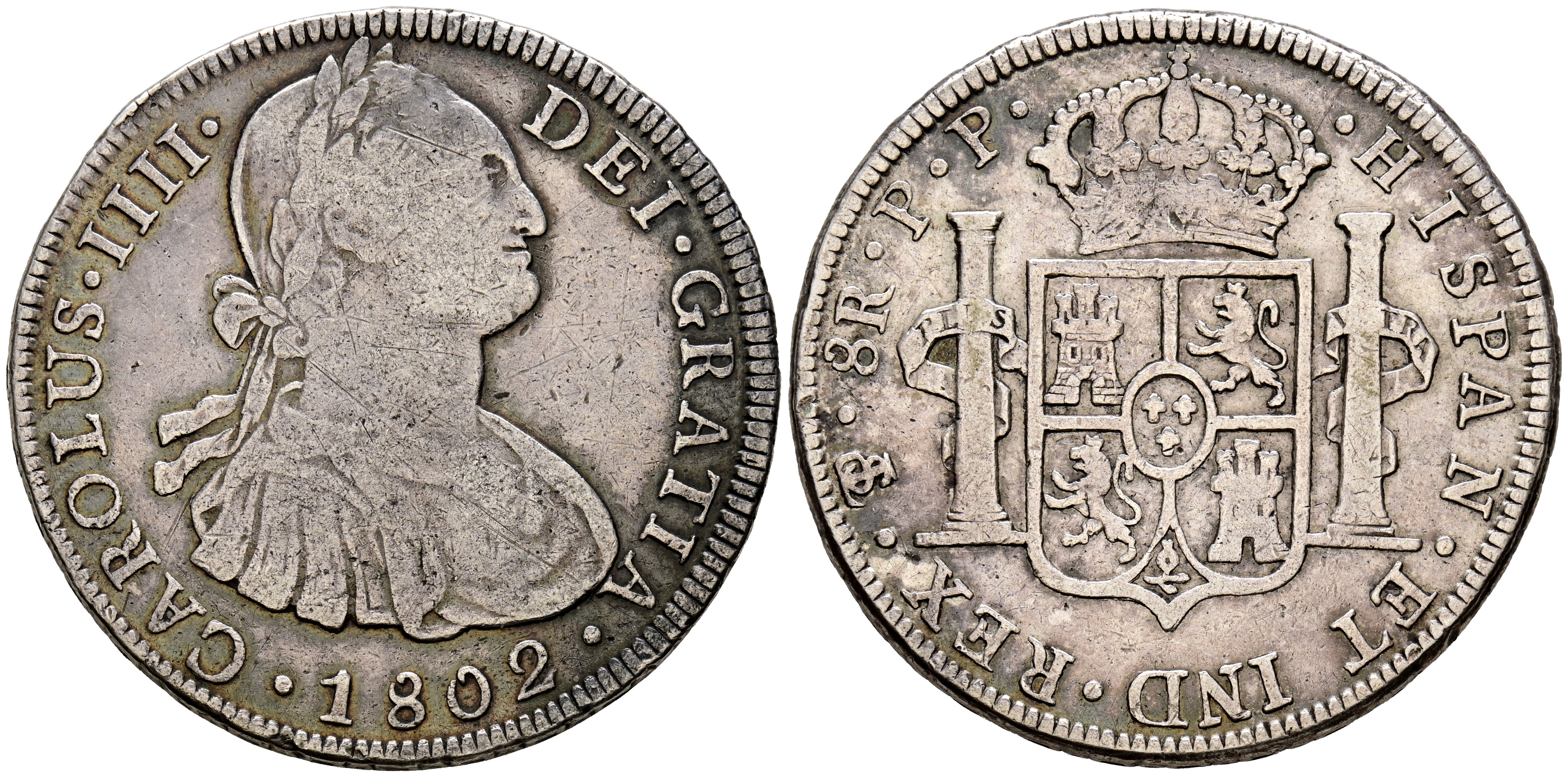 CHARLES IV (1788-1808). 8 Reales. (Ar. 26.61g/41mm). 1802. Potosí PP. (Cal-2019-1006). VF-.