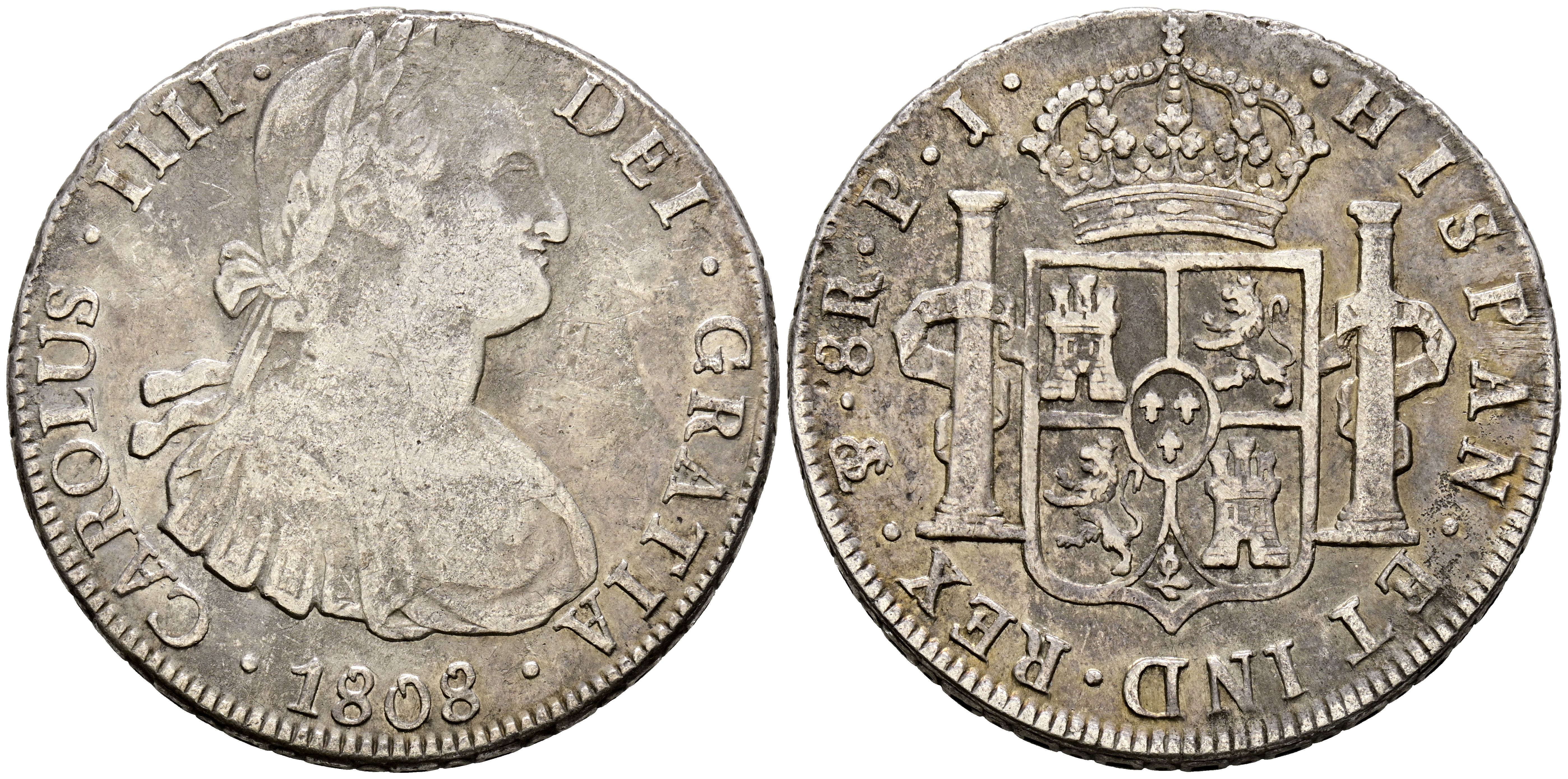 CHARLES IV (1788-1808). 8 Reales. (Ar. 26.61g/39mm). 1808. Potosí PJ. (Cal-2019-1014). VF-.