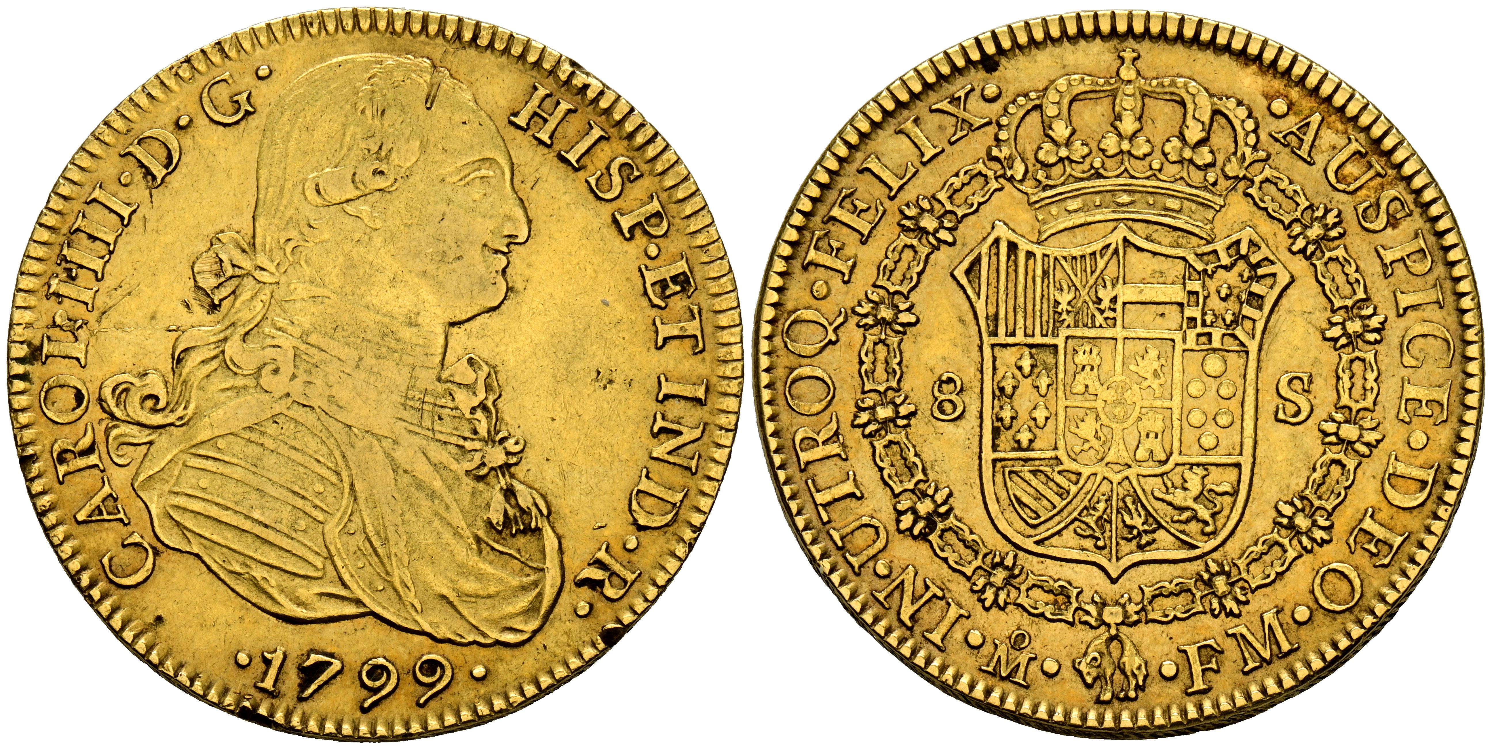 CHARLES IV (1788-1808). 8 Shields. (Au. 26.98g/37mm). 1799. Mexico FM. (Cal-2019-1640). Very Fine/Good Very Fine.