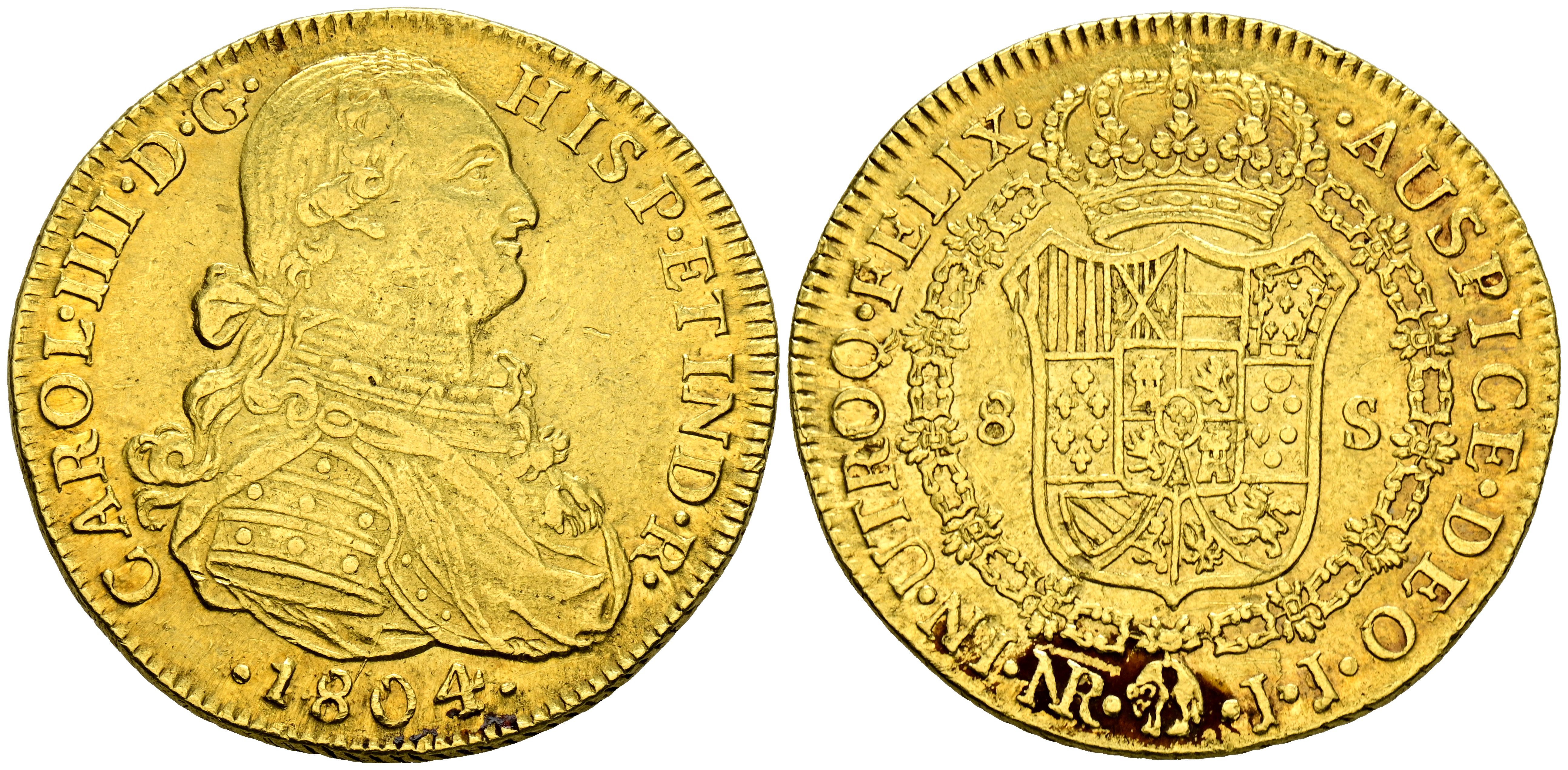 CHARLES IV (1788-1808). 8 Escudos. (Au. 26.94g/37mm). 1804. Santa Fe de Nuevo Reino JJ. (Cal-2019-1744). VF+.