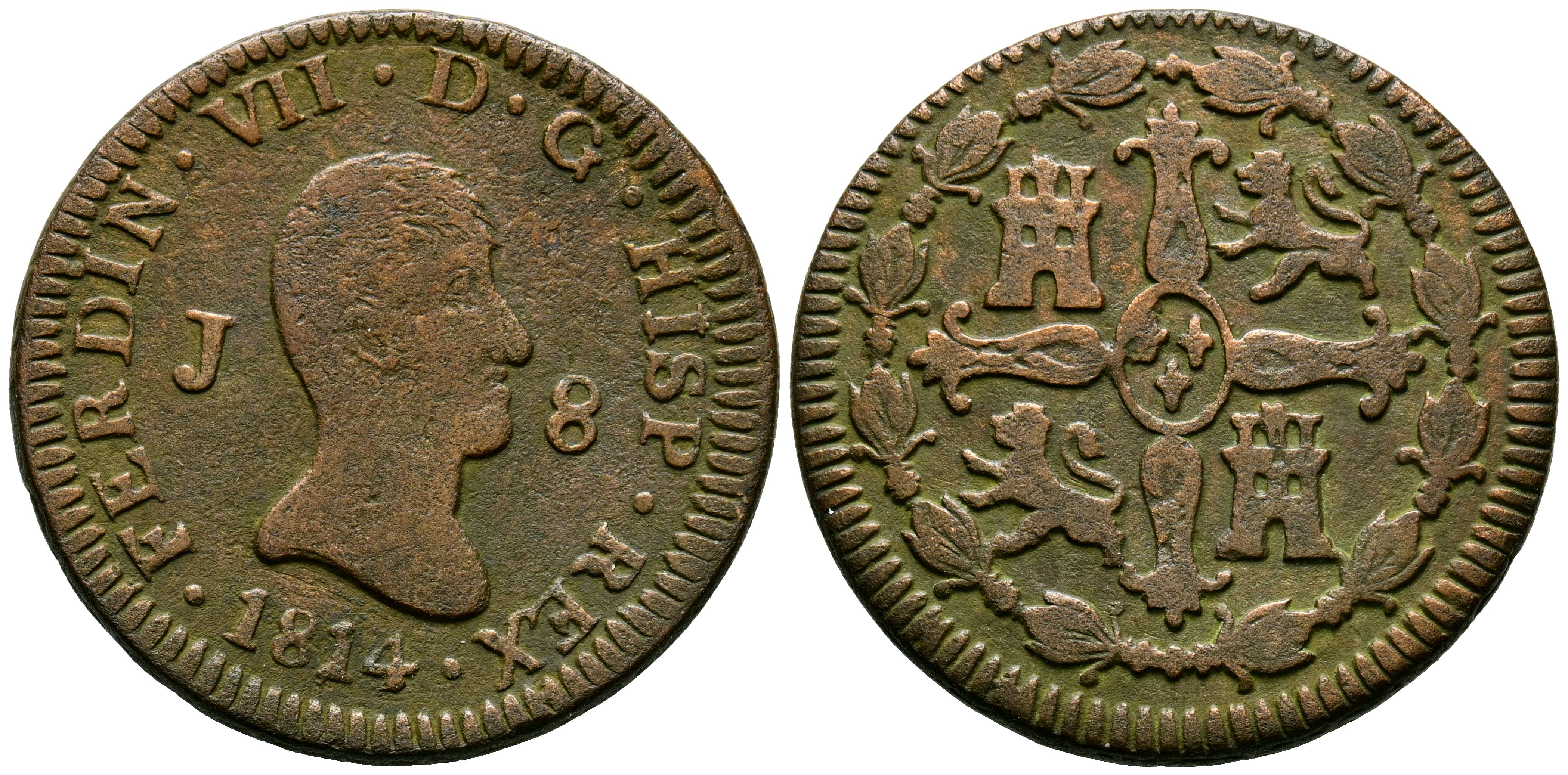 FERDINAND VII (1808-1833). 8 Maravedis. (Ae. 9.55g/29mm). 1814. Jubia. Naked bust. (Cal-2019-192). Very Fine.