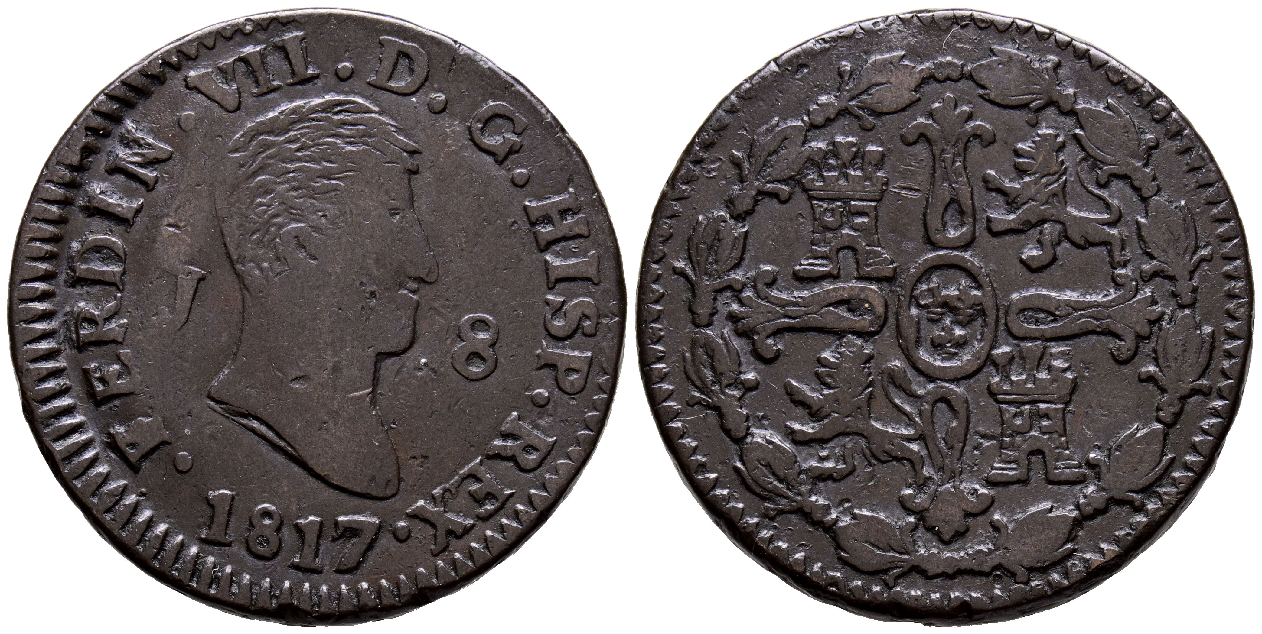 FERDINAND VII (1808-1833). 8 Maravedis. (Ae. 9.88g/29mm). 1817. Jubia. (Cal-2019-196). Naked bust. Very Fine.
