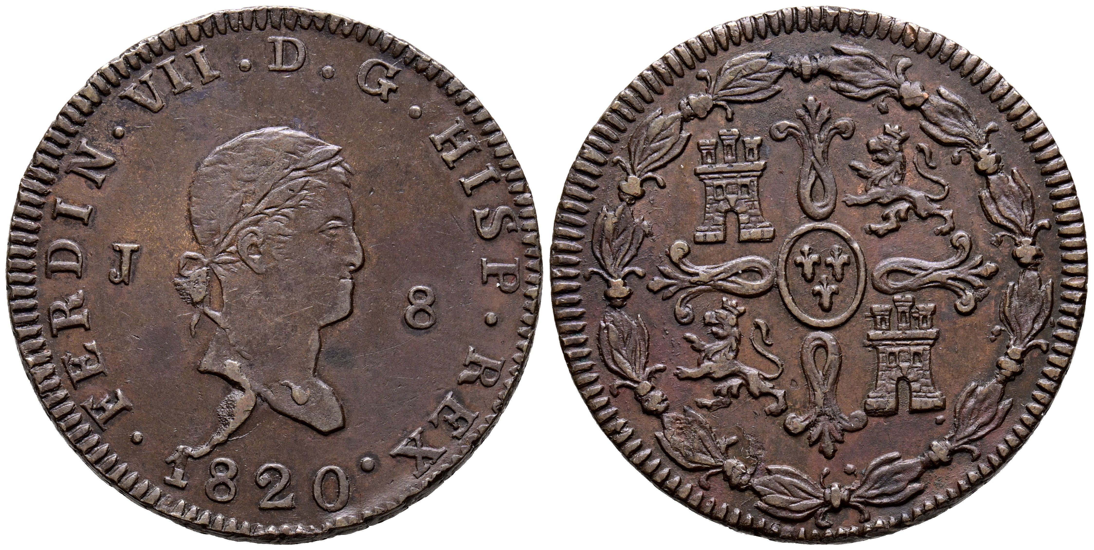 English FERDINAND VII (1808-1833). 8 Maravedis. (Ae. 9.72g/29mm). 1820. Jubia. (Cal-2019-200). Laureate bust. Very Fine/Good Very Fine. Excess metal on obverse.