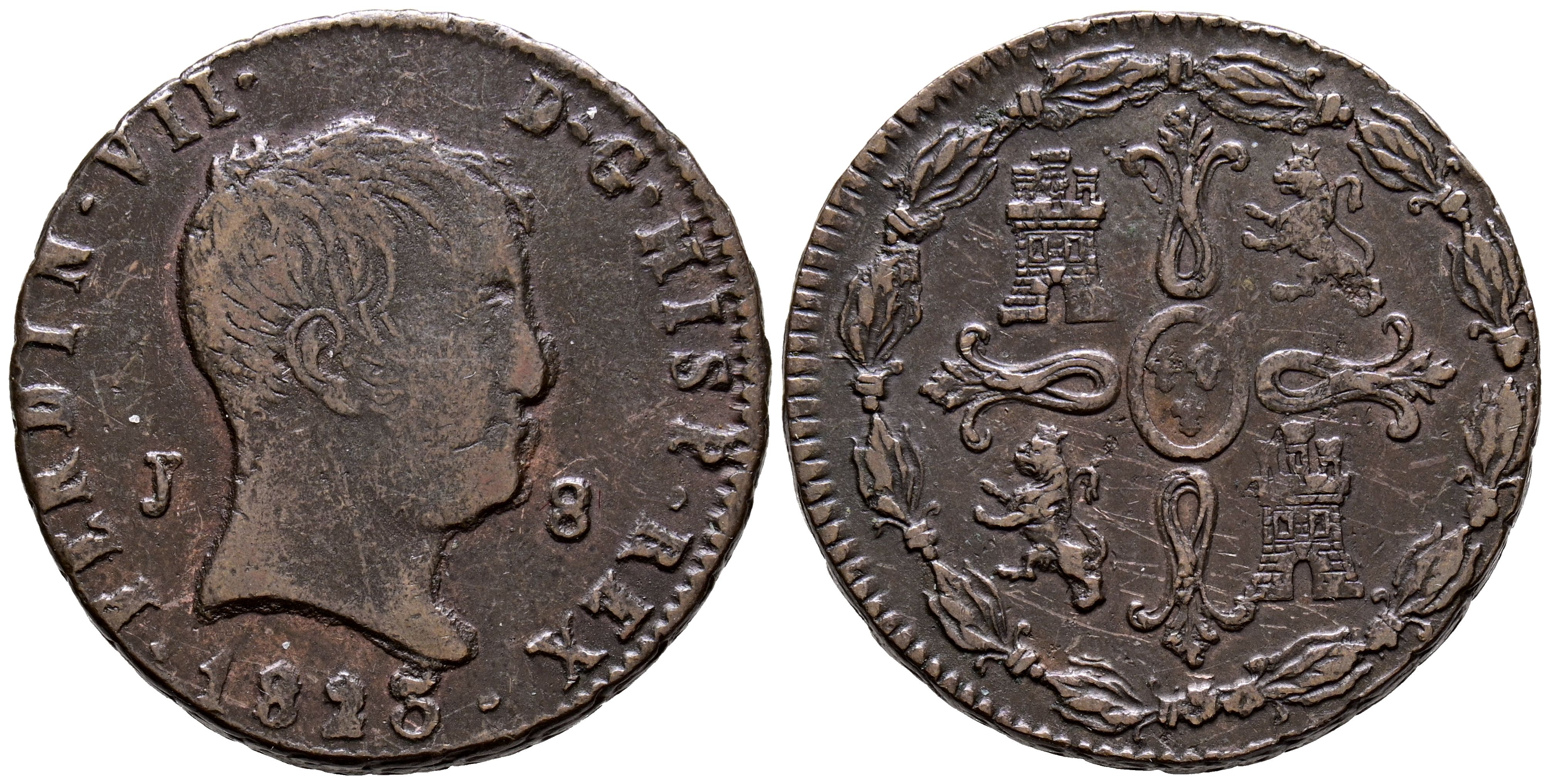 English FERDINAND VII (1808-1833). 8 Maravedis. (Ae. 10.74g/29mm). 1823. Jubia. (Cal-2019-206). Big-headed type. Mint mark on obverse. Very Fine.