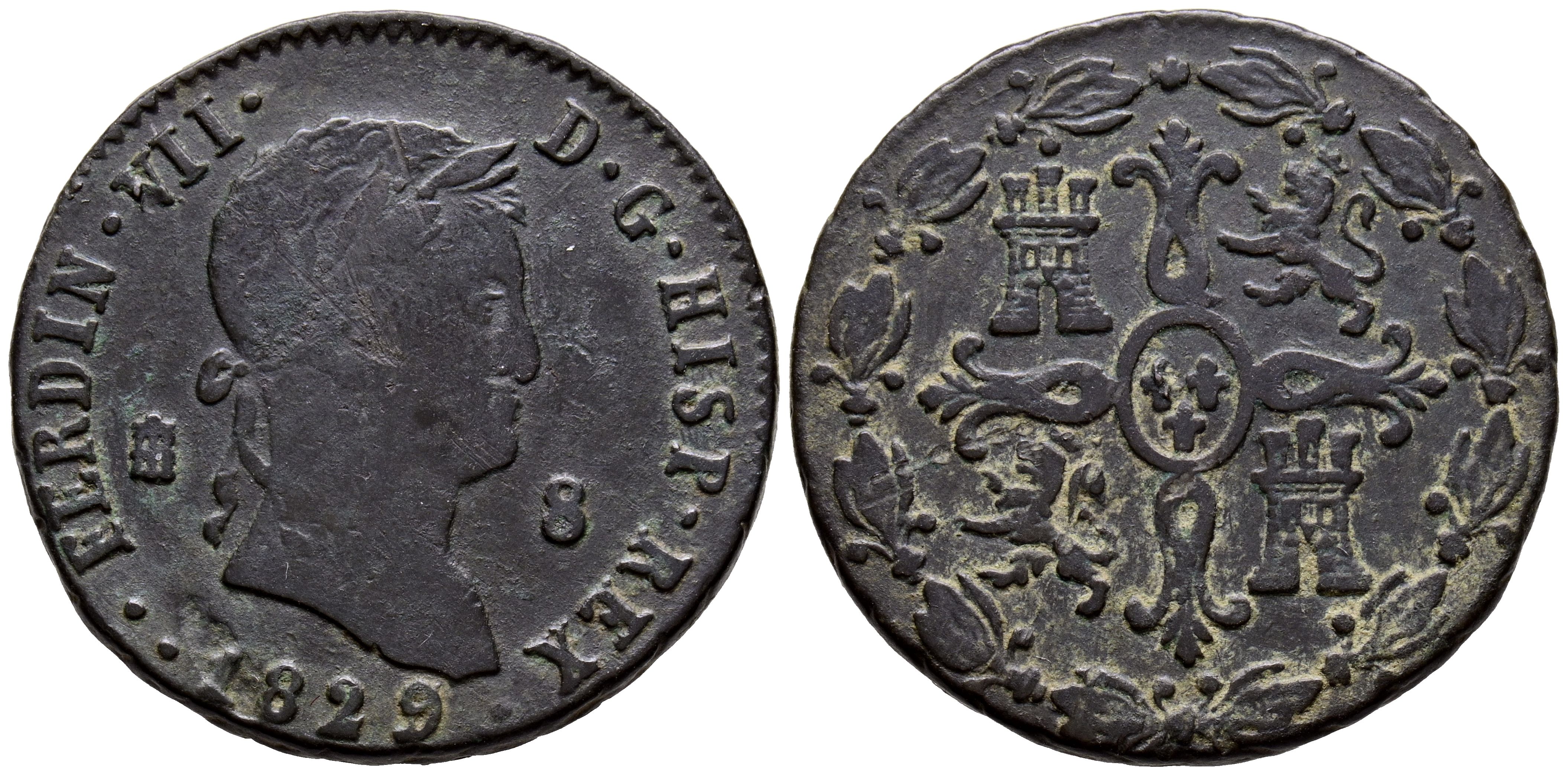 FERDINAND VII (1808-1833). 8 Maravedis. (Ae. 11.49g/30mm). 1829/7. Segovia. (Cal-2019-232). Overdate. Very Fine.