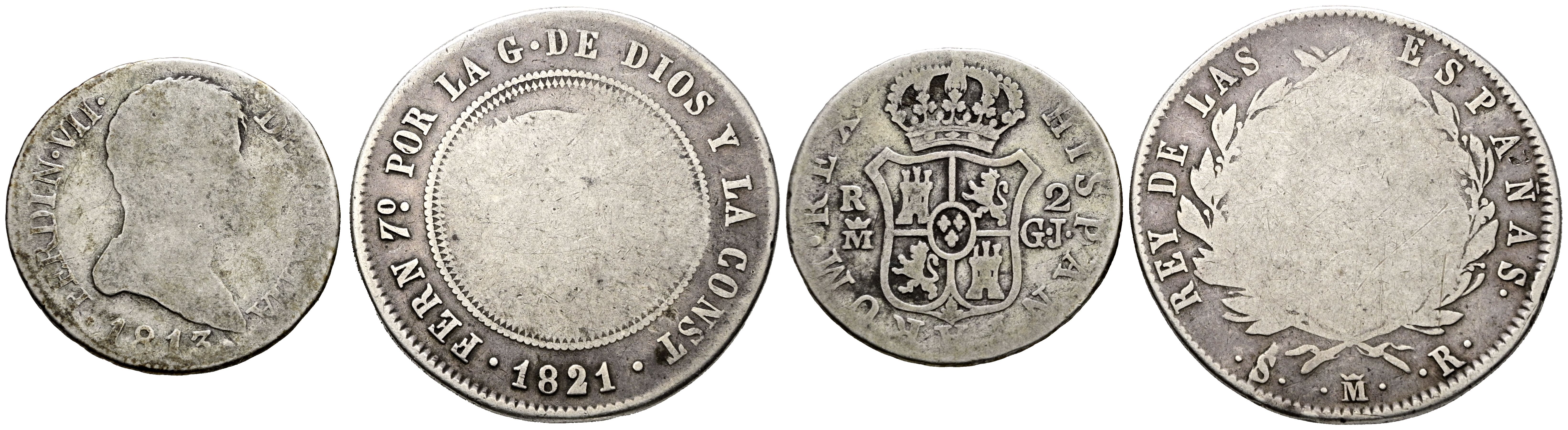 FERNANDO VII (1808-1833). Set of 2 silver pieces of 2 and 10 Reales (1813 and 1821 respectively). Madrid. Different states of preservation. TO BE EXAMINED.