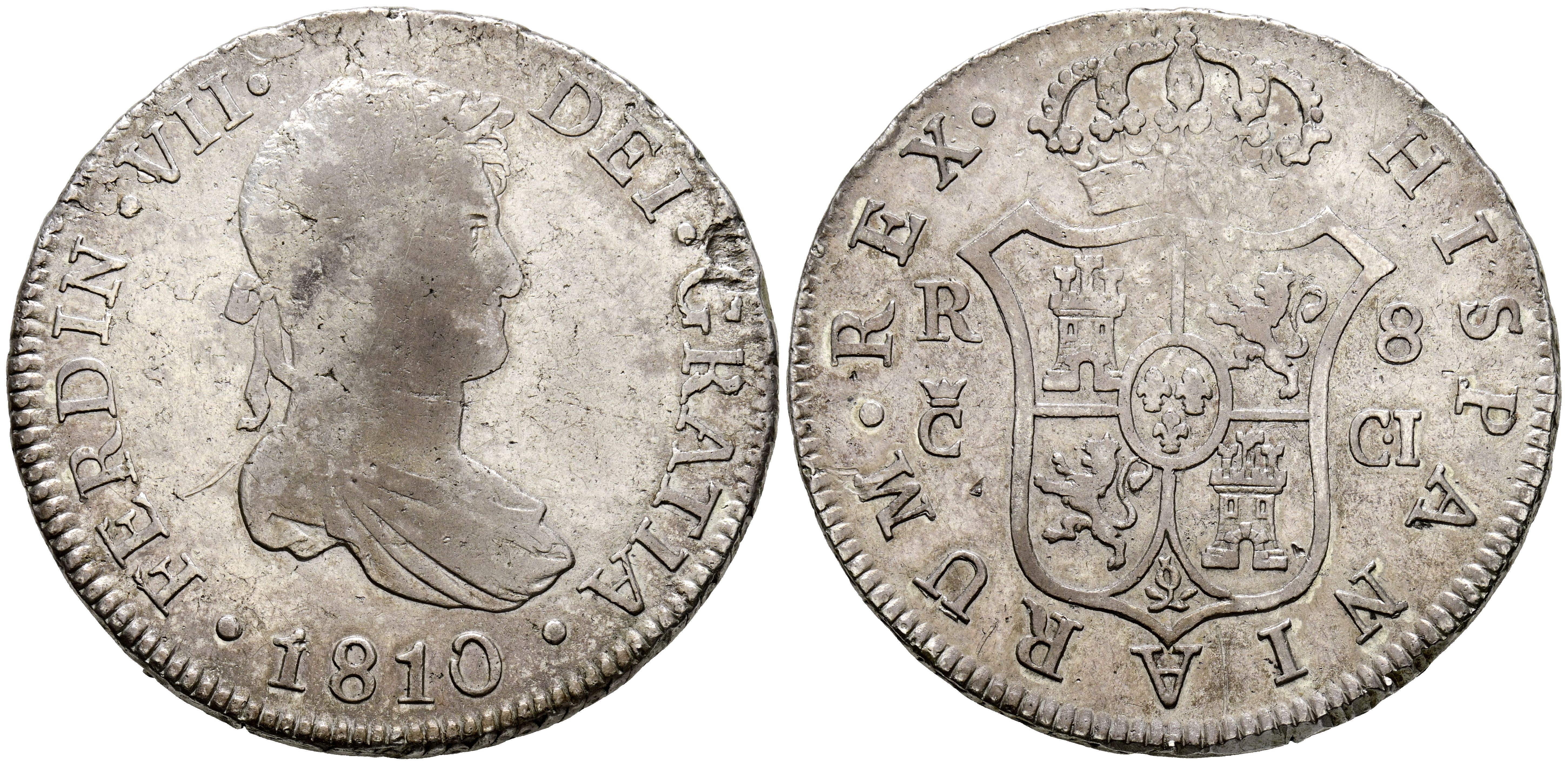 FERNANDO VII (1808-1833). 8 Reales. (Ar. 26,70g/41mm). 1810. Cádiz CI. (Cal-2019-1147). VF. Areas of weak minting typical of these pieces. Rare.