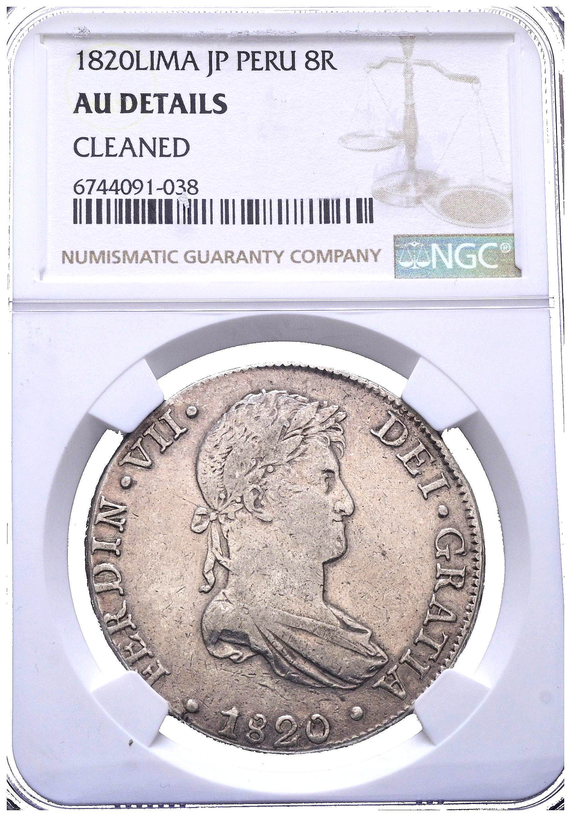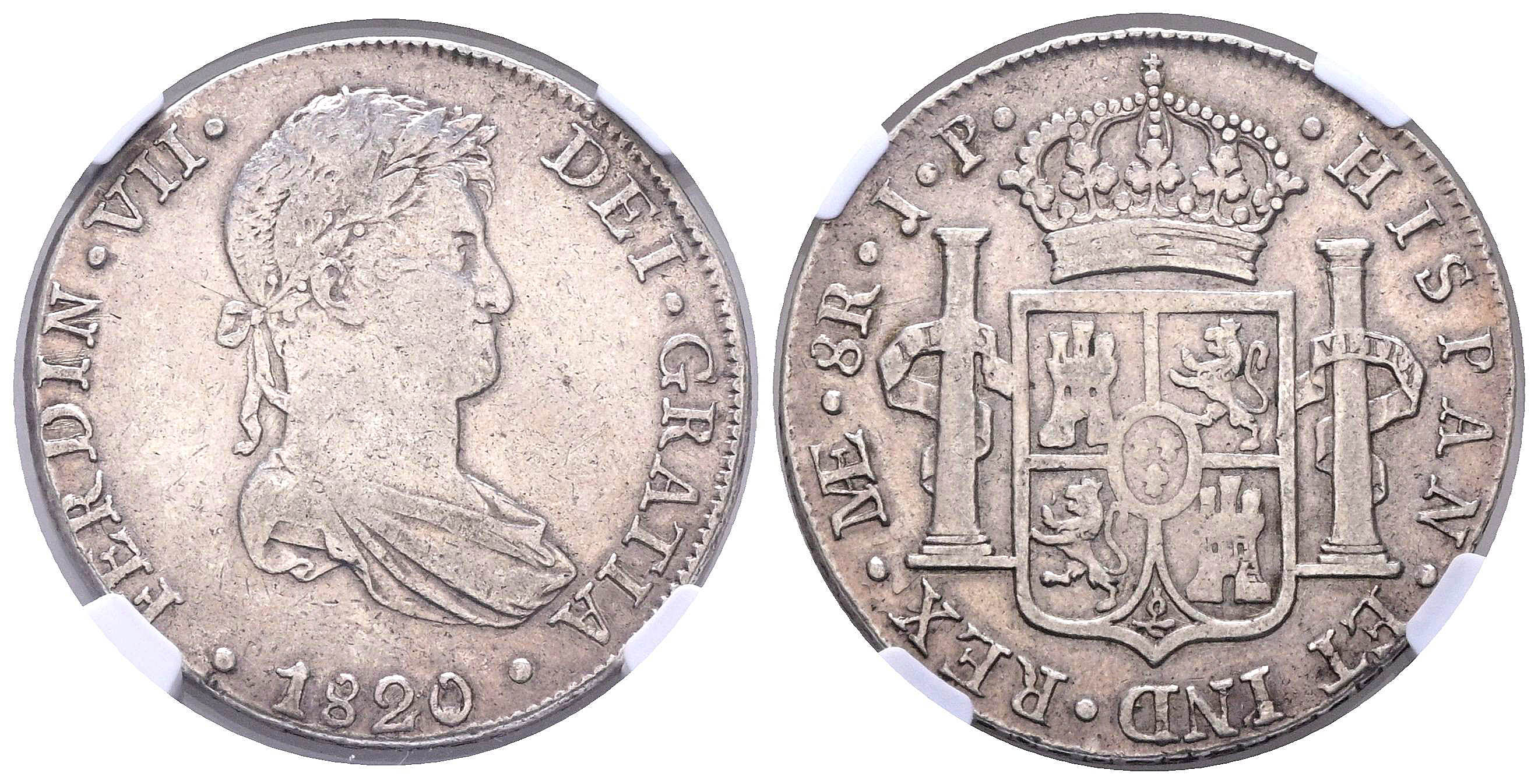 FERNANDO VII (18080-1833). 8 Reales. (Ar. 27,00g/38mm)*. 1820. Lima JP. (Cal-2019-1253). Encapsulated by NGC UNC Details, Cleaned. *Theoretical weight and measurements.