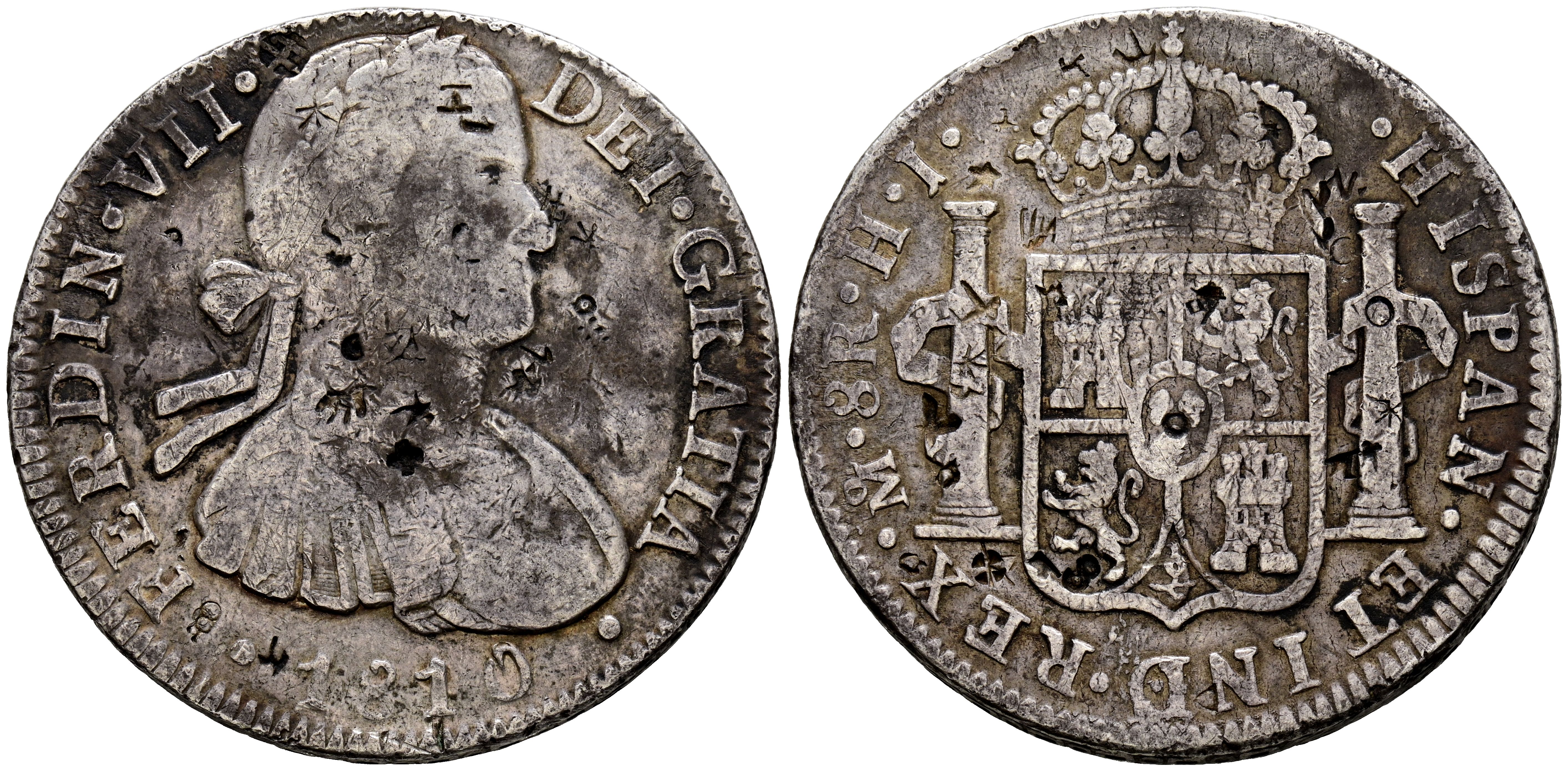 FERNANDO VII (1808-1833). 8 Reales. (Ar. 26,56g/39mm). 1810. Mexico HJ. (Cal-2019-1314). VF-. Multiple countermarks.