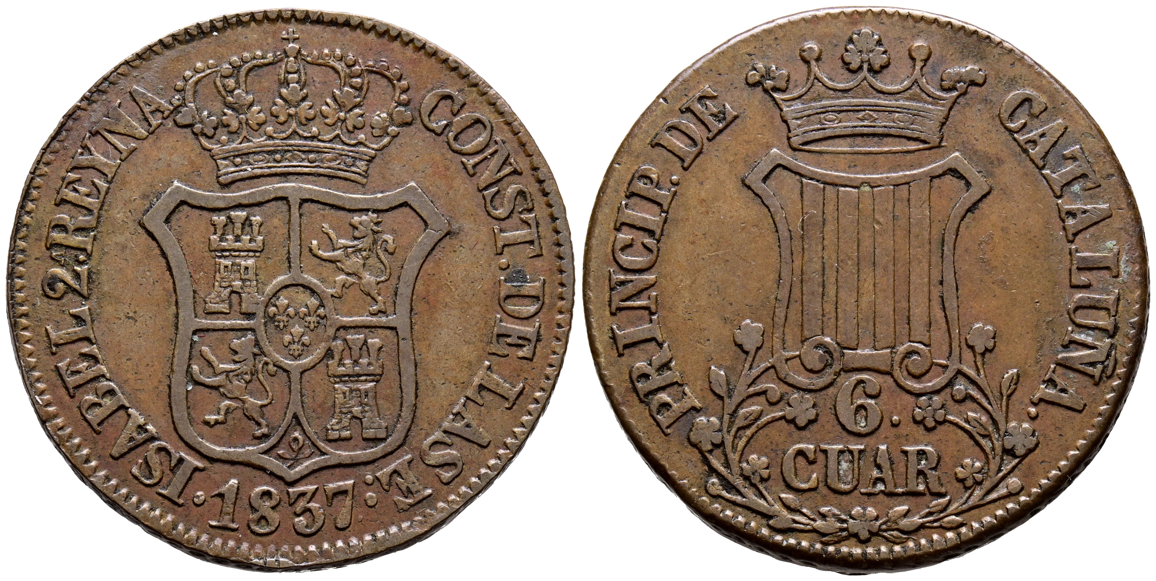 ELIZABETH II (1833-1868). 6 Rooms. (Ae. 12.79g/33mm). 1837. Barcelona. (Cal-2019-17). Very Fine.
