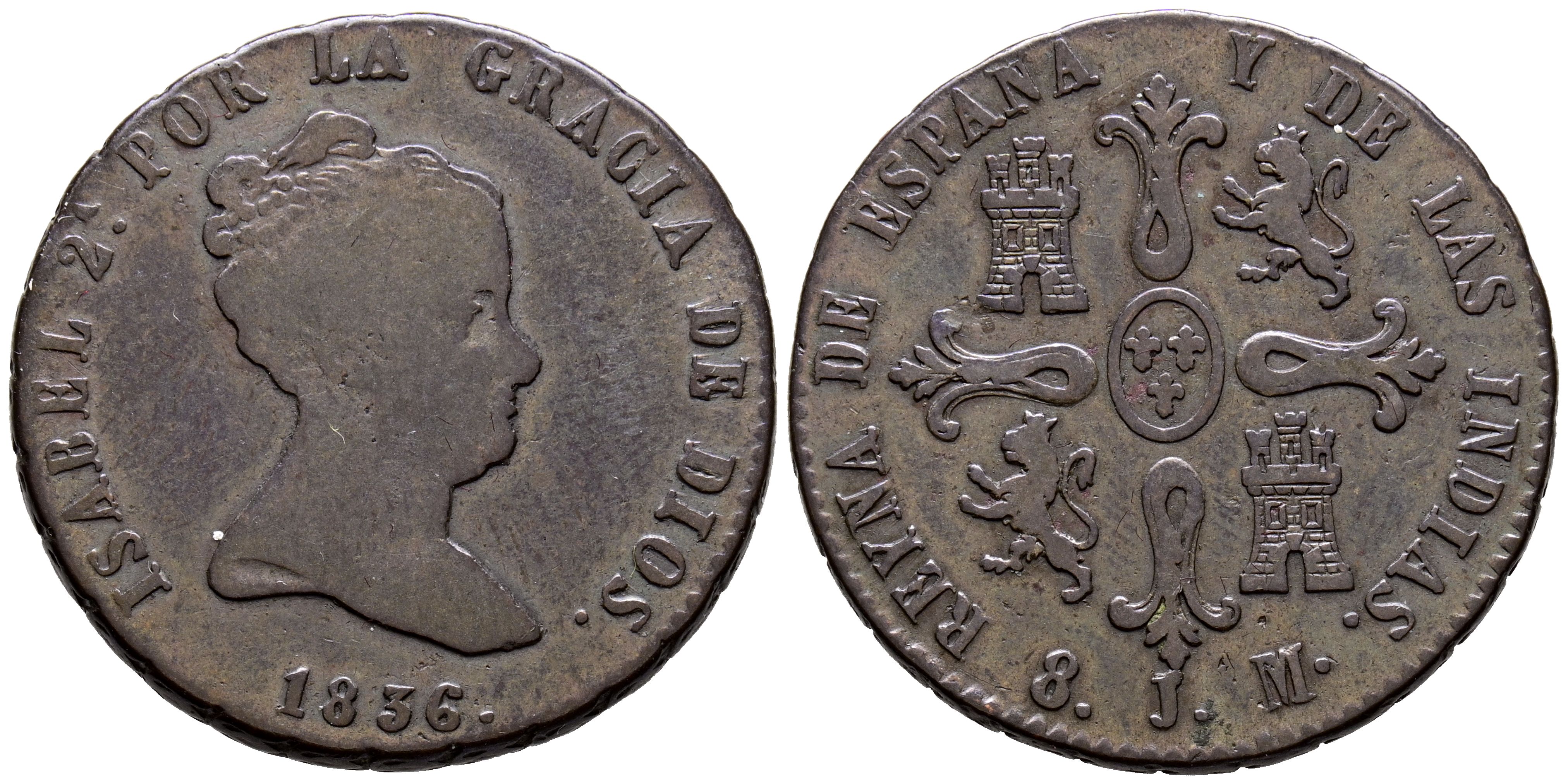ELIZABETH II (1833-1868). 8 Maravedis. (Ae. 9.82g/29mm). 1836. Jubia. (Cal-2019-102). Value on reverse. Very Fine. Scarce.