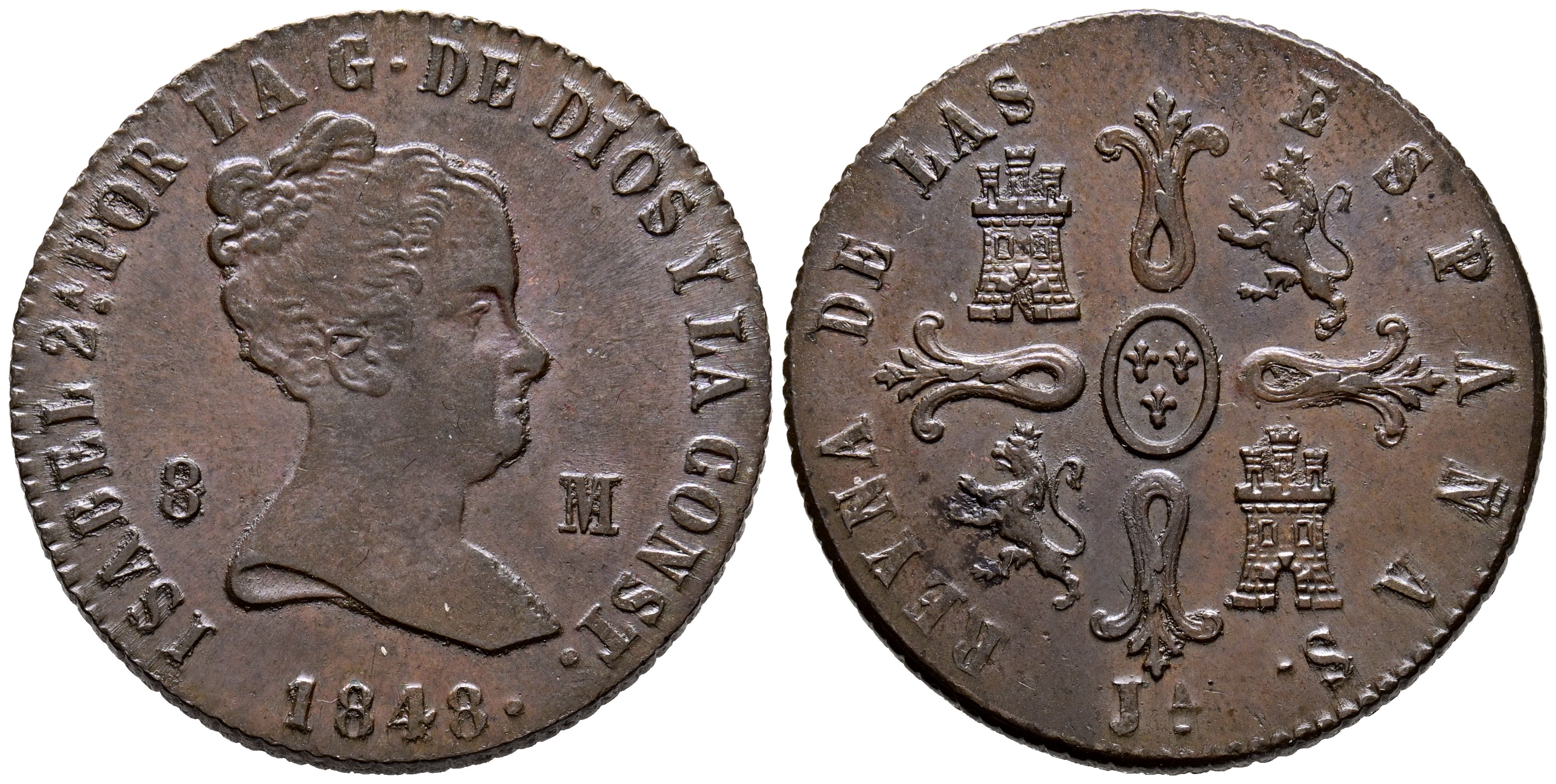 ISABEL II (1833-1868). 8 Maravedís. (Ae. 10.27g/29mm). 1848. Jubia. (Cal-2019-115). Extremely Fine. Nice specimen.