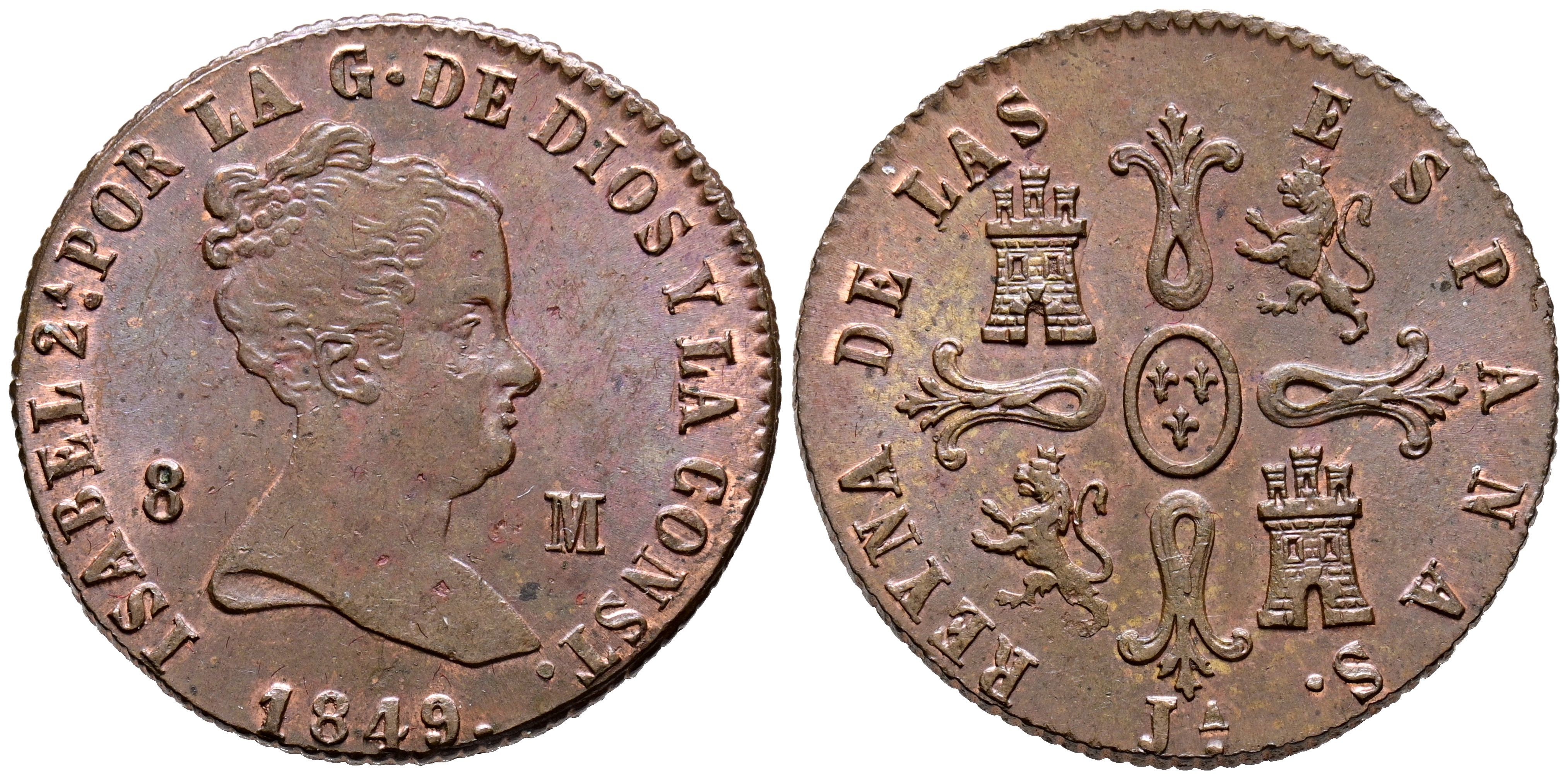 ISABEL II (1833-1868). 8 Maravedís. (Ae. 9.49g/29mm). 1849. Jubia. (Cal-2019-116). Good Extremely Fine. Beautiful specimen with a nice patina.