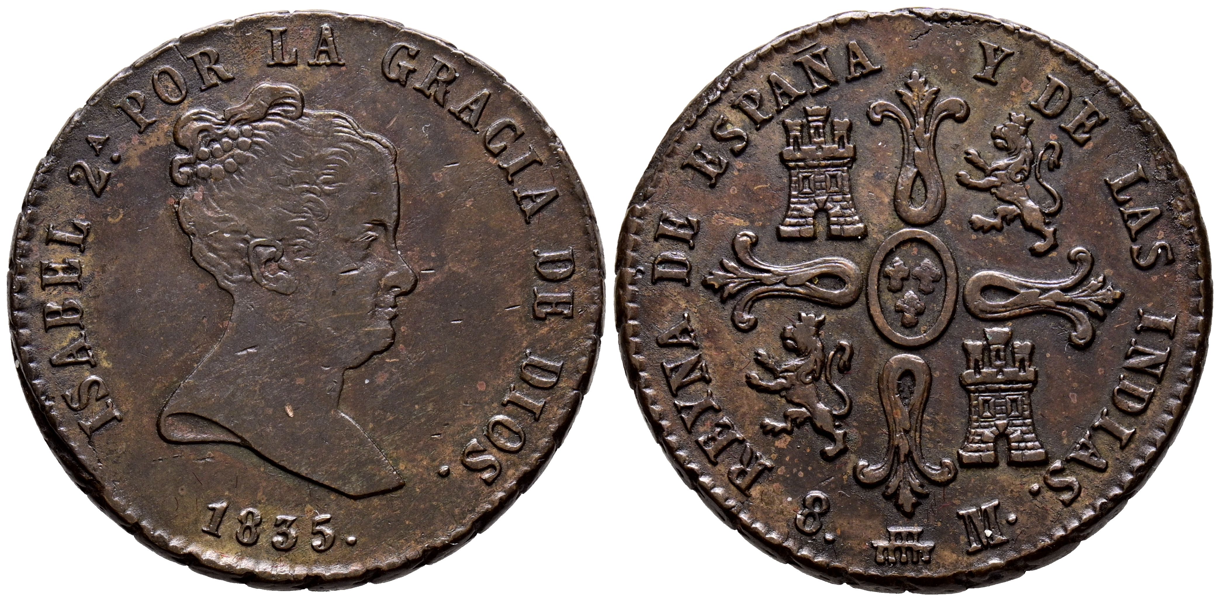 ELIZABETH II (1833-1868). 8 Maravedis. (Ae. 11.31g/29mm). 1835. Segovia. (Cal-2019-121). Value on reverse. Good Very Fine. Scarce.