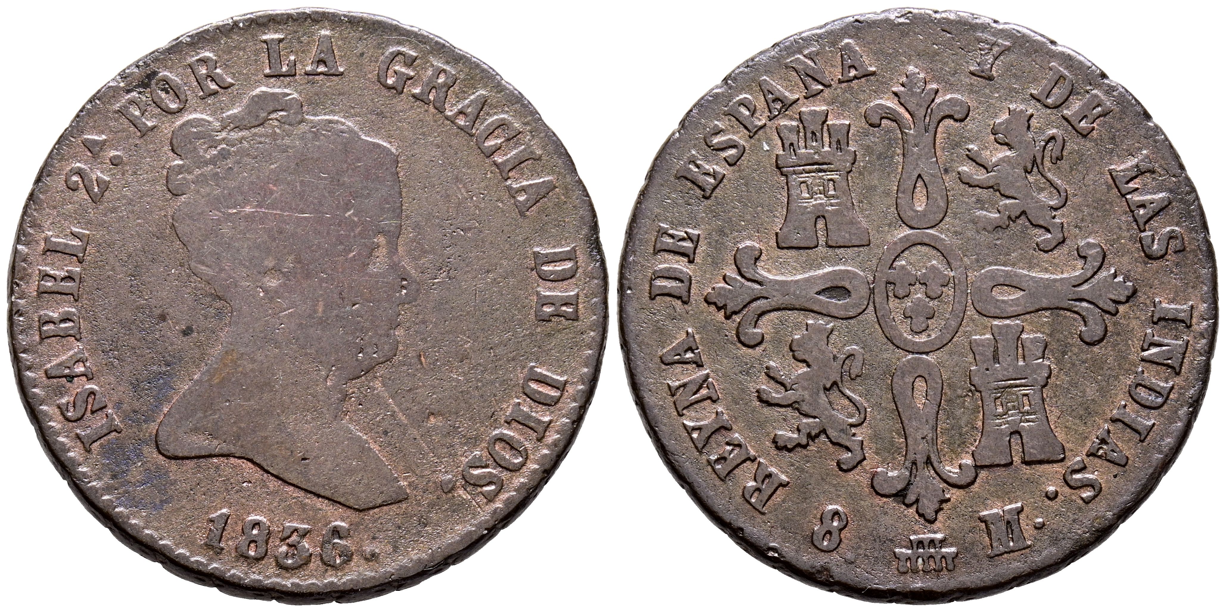 ISABEL II (1833-1868). 8 Maravedís. (Ae. 9.94g/29mm). 1836. Segovia. (Cal-2019-122). Value on reverse. VF-. Scarce.