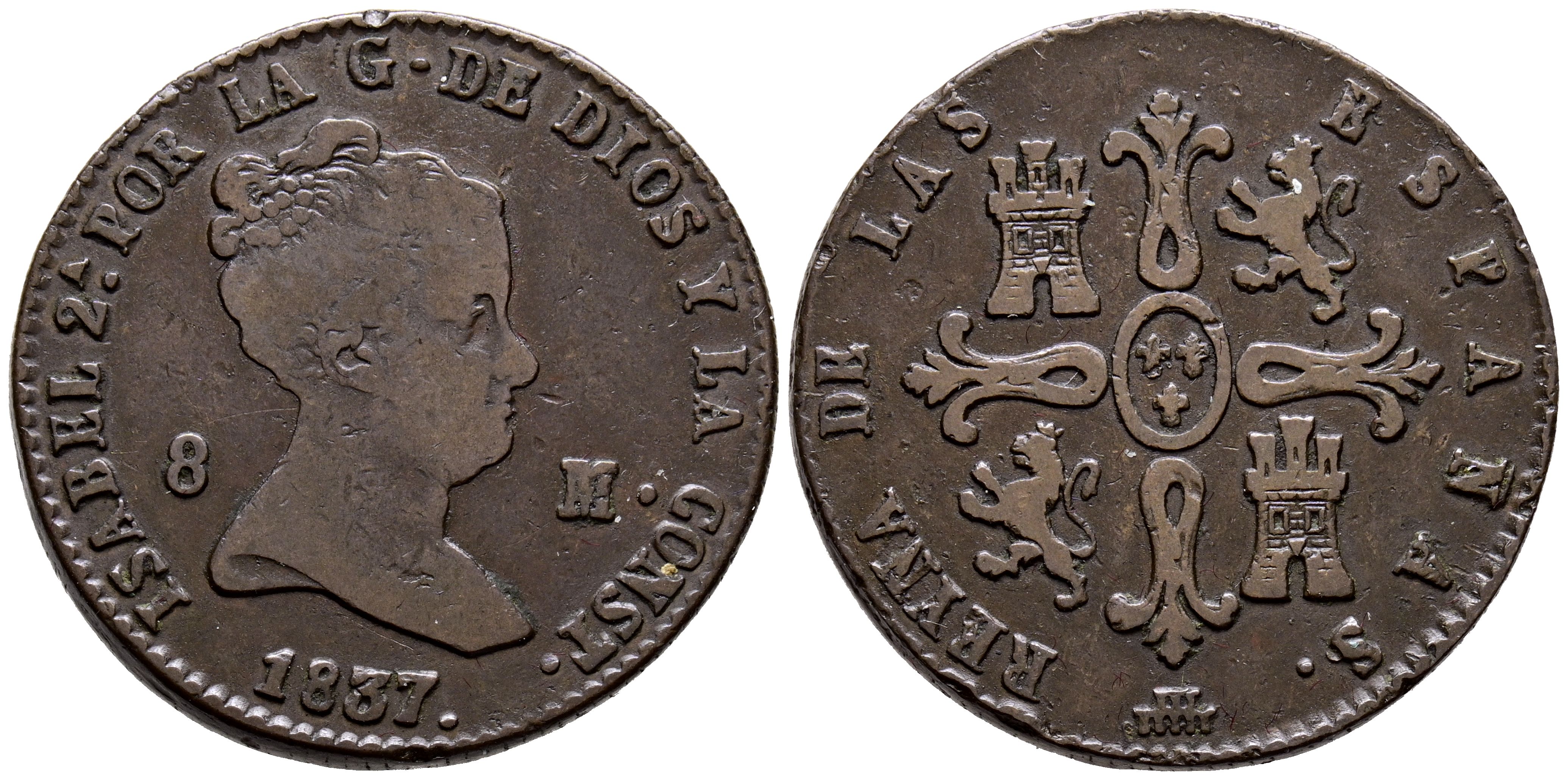 English ELIZABETH II (1833-1868). 8 Maravedis. (Ae. 11.07g/29mm). 1837. Segovia. (Cal-2019-123). Very Fine-.