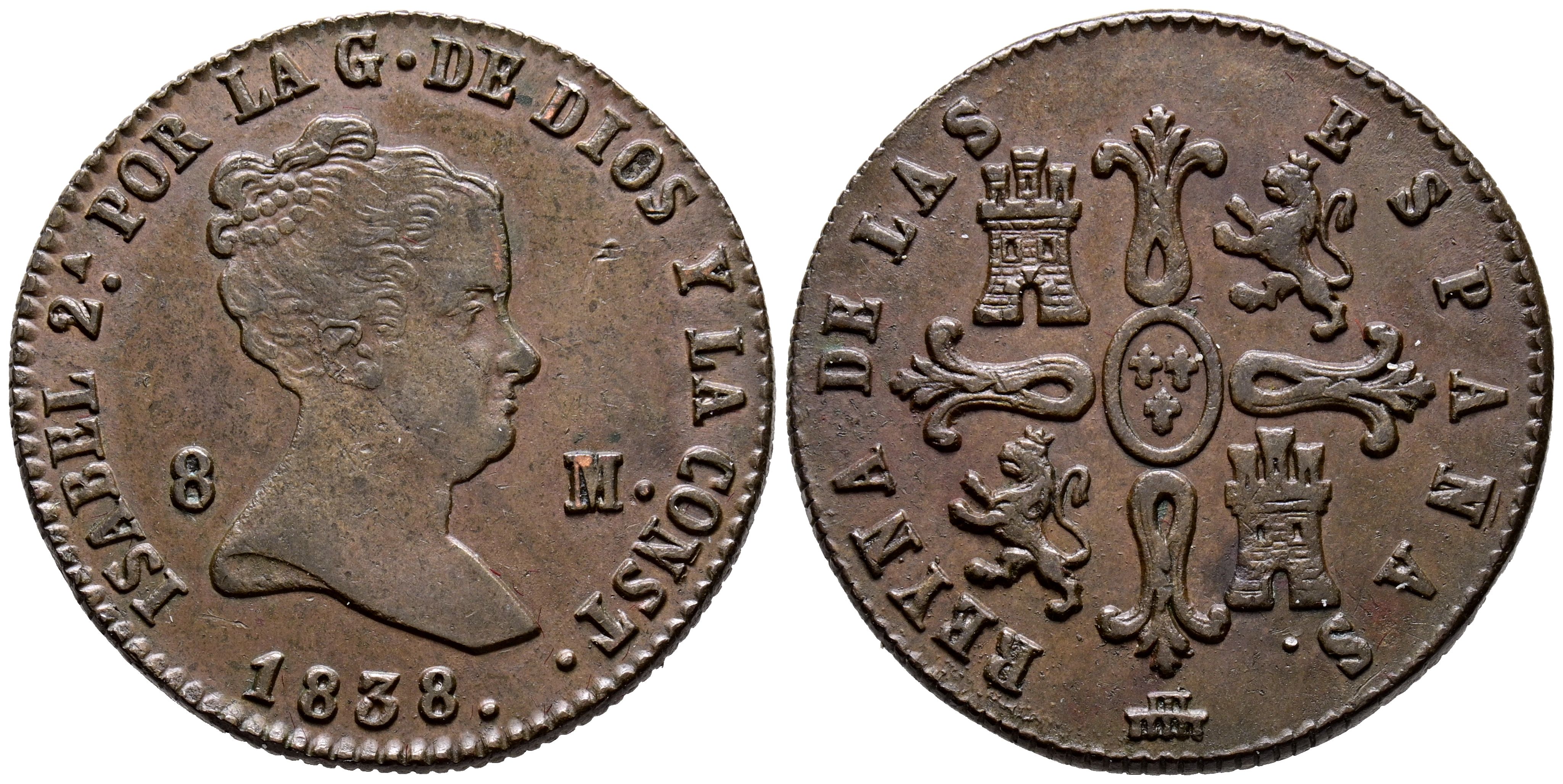 ELIZABETH II (1833-1868). 8 Maravedis. (Ae. 10.05g/29mm). 1838. Segovia. (Cal-2019-124). Good Very Fine.