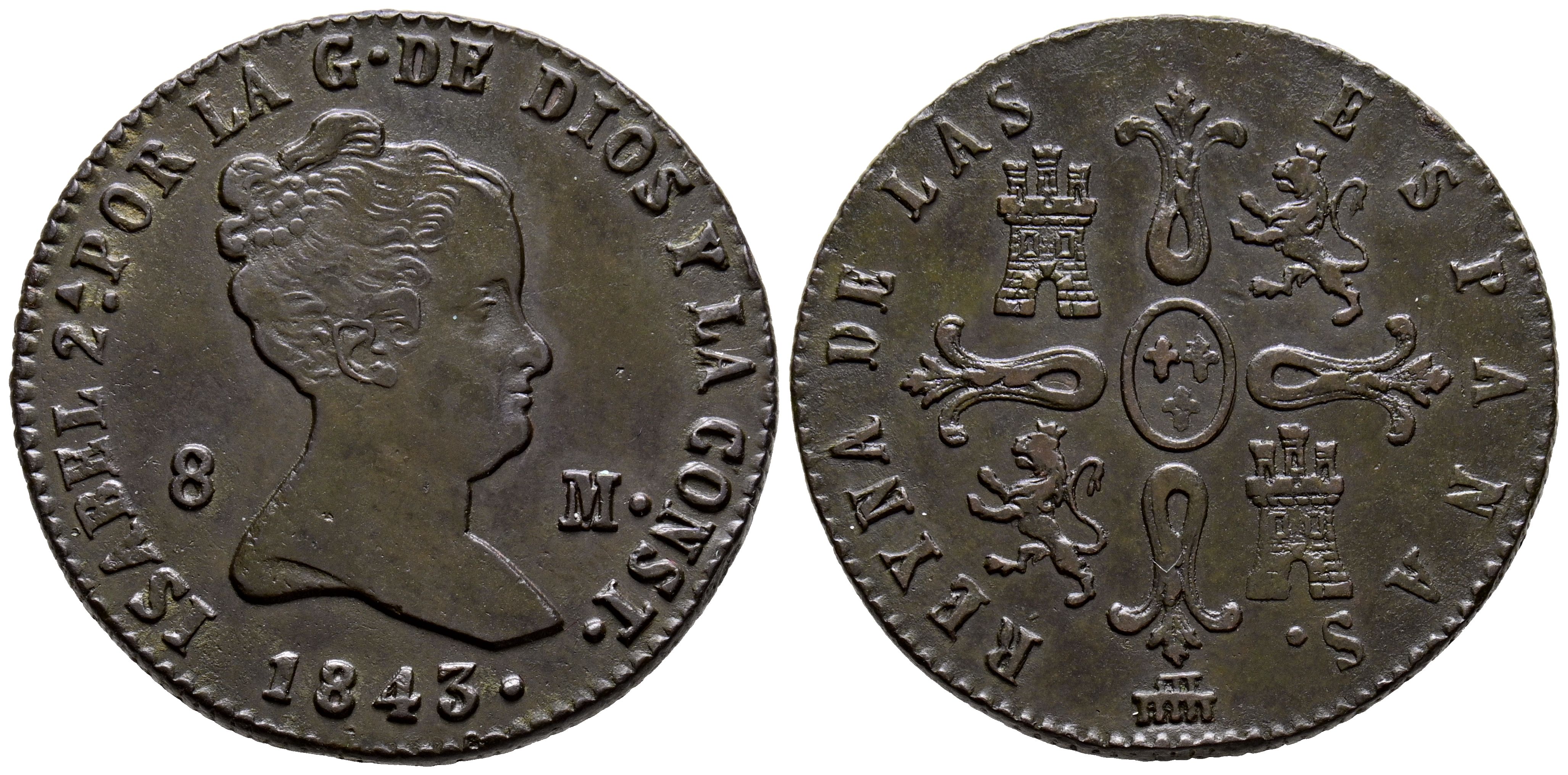 ELIZABETH II (1833-1868). 8 Maravedis. (Ae. 10.19g/29mm). 1843. Segovia. (Cal-2019-130). Good Very Fine.
