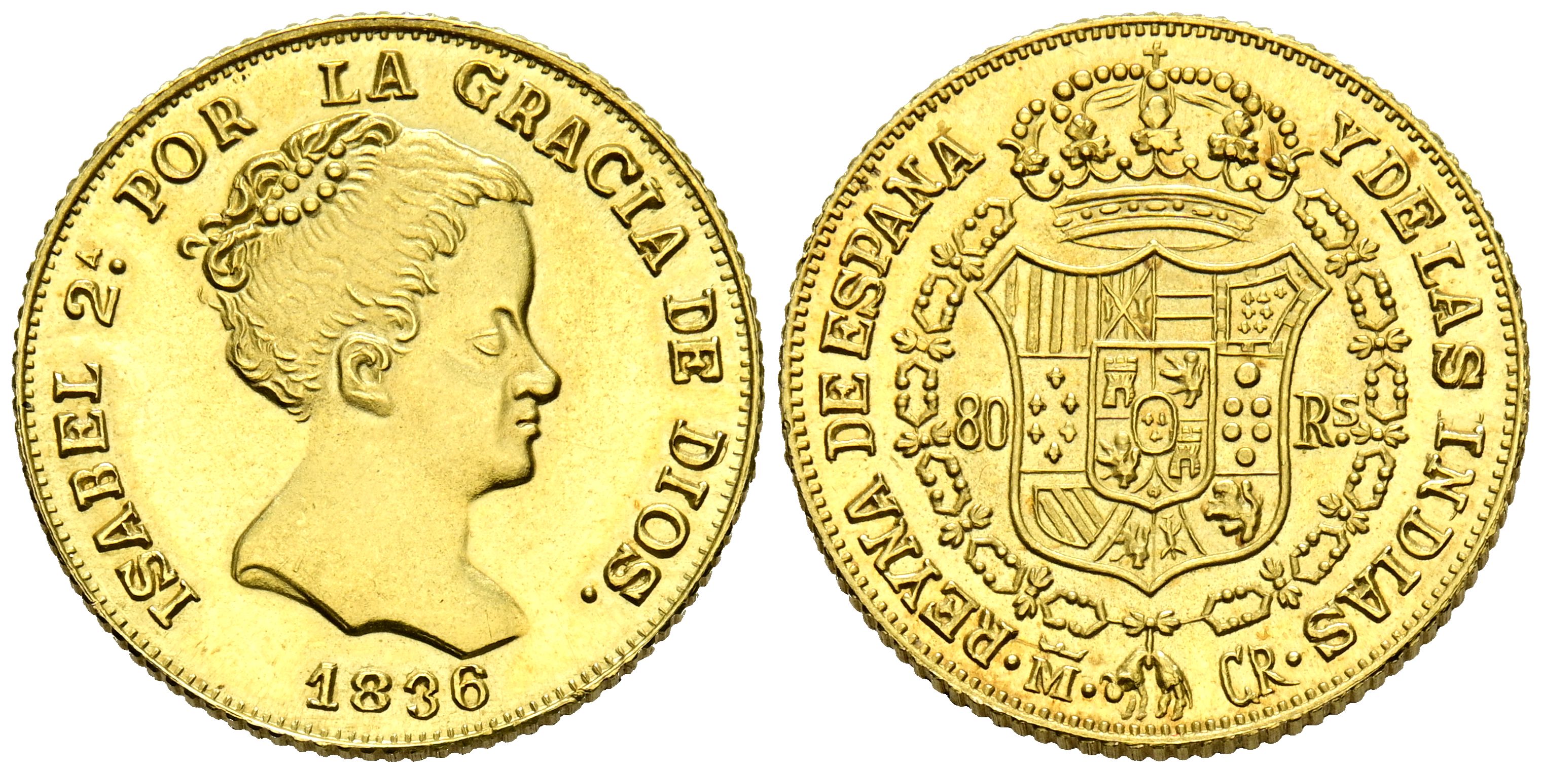 ISABEL II (1833-1868). 80 Reales. (Au. 6.68g/21mm). 1836. Madrid CR. Jeweler's copy in 0.750 thousandths gold. UNC.